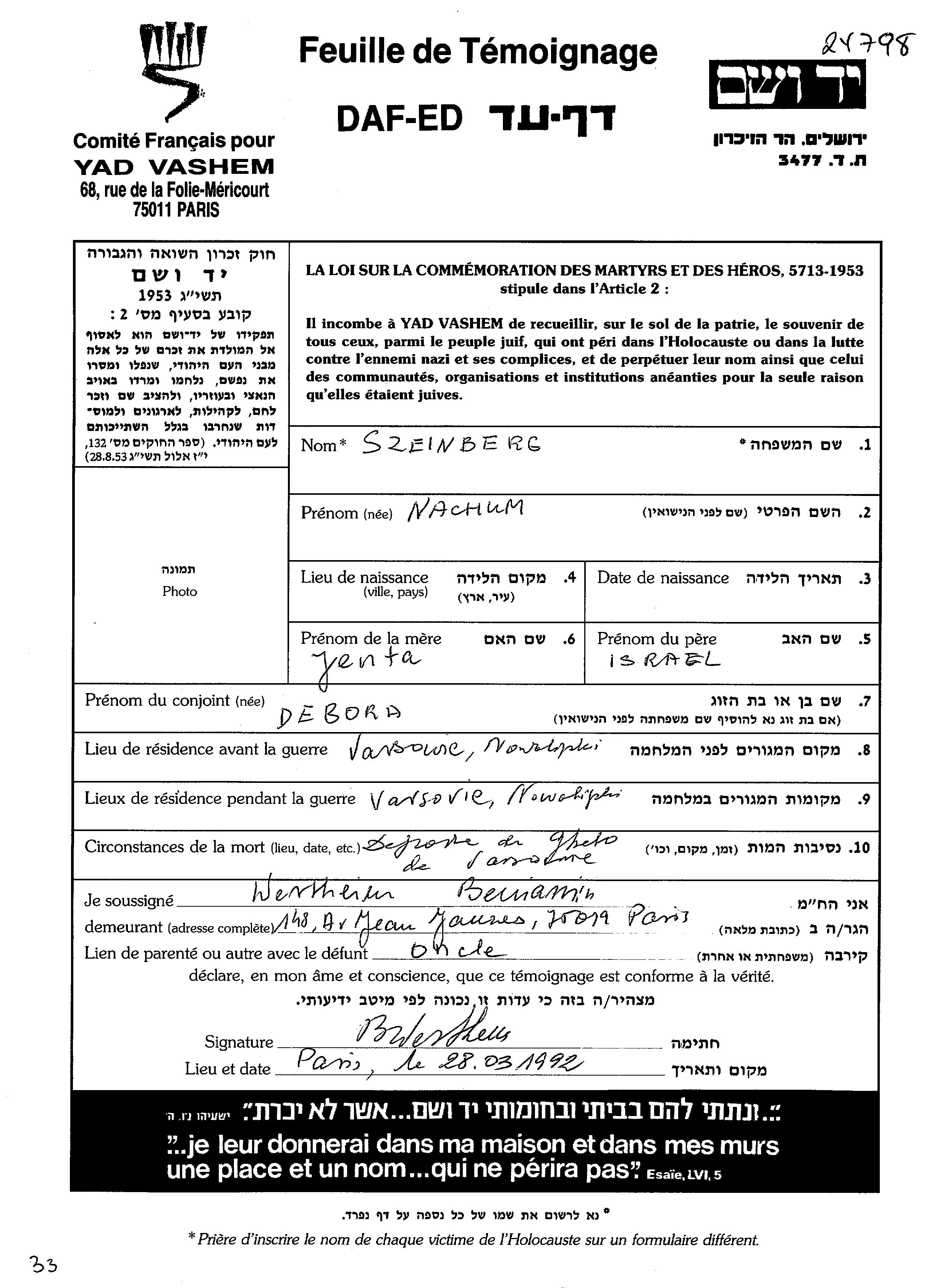 Nachum Szeinberg wurde Er war der Sohn von Israel und Jenta. Er war mit Debora Verheiratet. Vor dem Zweiten Weltkrieg lebte er in Warszawa, Polen. Während des Krieges war er in Warszawa, Polen.