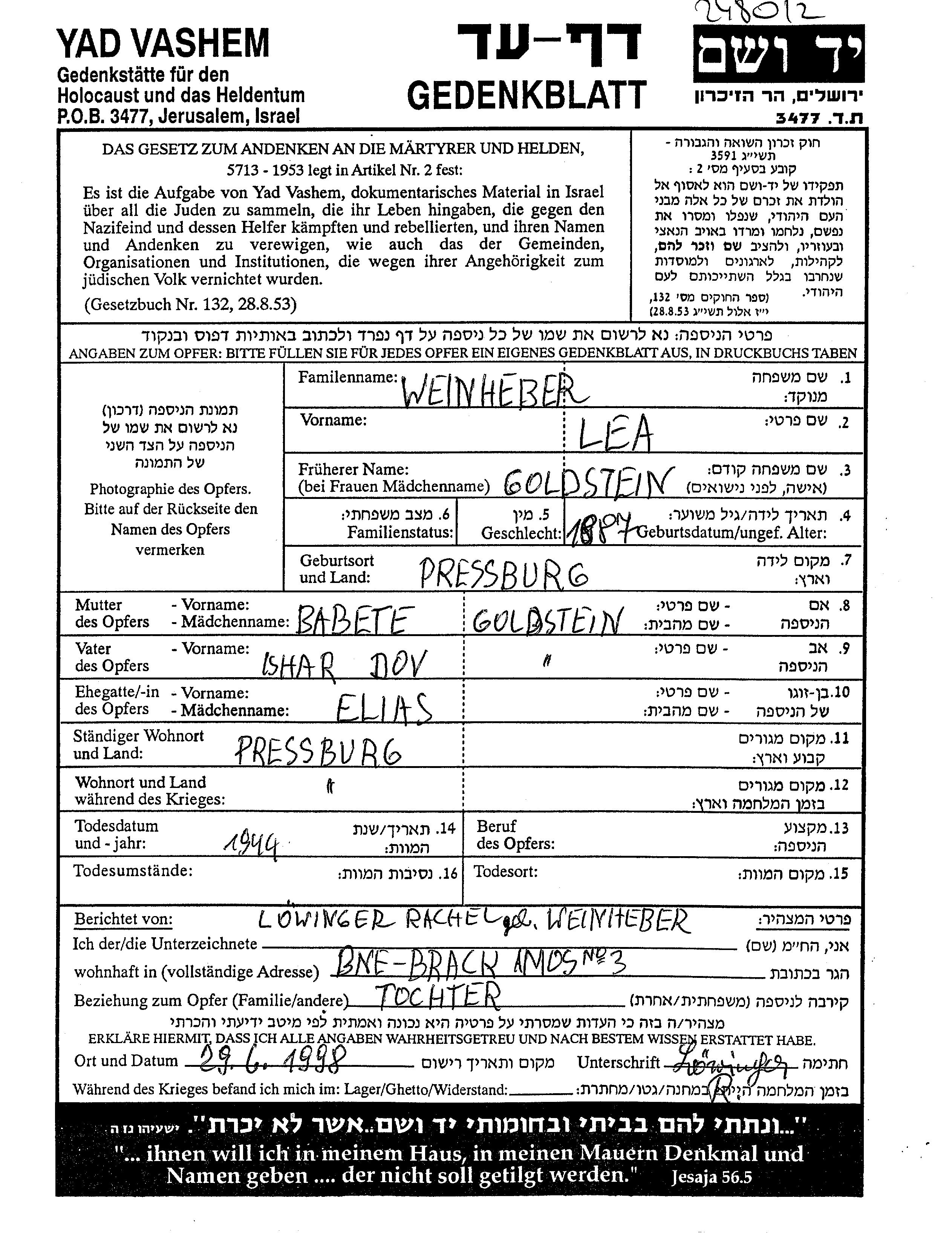 Lea Weinheber, geb. Goldstein wurde im Jahr 1887 in Pressburg, Tschechoslowakei geboren. Sie war die Tochter von Ishar Dov Yisrael und Babete, geb. Goldstein. Sie war mit Elias Verheiratet. Vor dem Zweiten Weltkrieg lebte sie in Pressburg, Tschechoslowakei. Während des Krieges war sie in Pressburg, Tschechoslowakei.