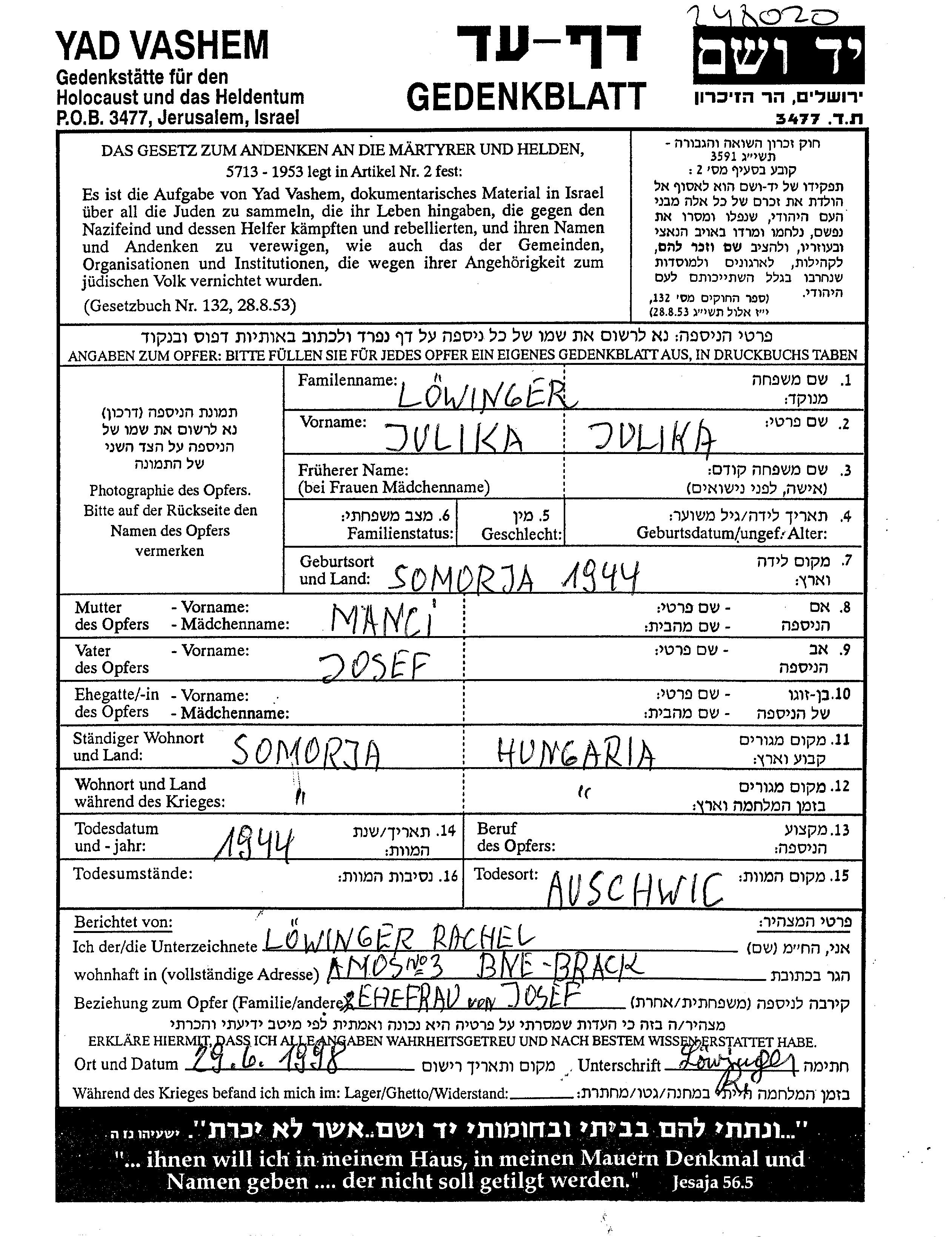 Julika Löwinger wurde in Somorja, Tschechoslowakei geboren. Sie war die Tochter von Josef und Manci, geb. Roth Rut. Sie war Kind. Vor dem Zweiten Weltkrieg lebte sie in Somorja, Tschechoslowakei. Während des Krieges war sie in Somorja, Tschechoslowakei.