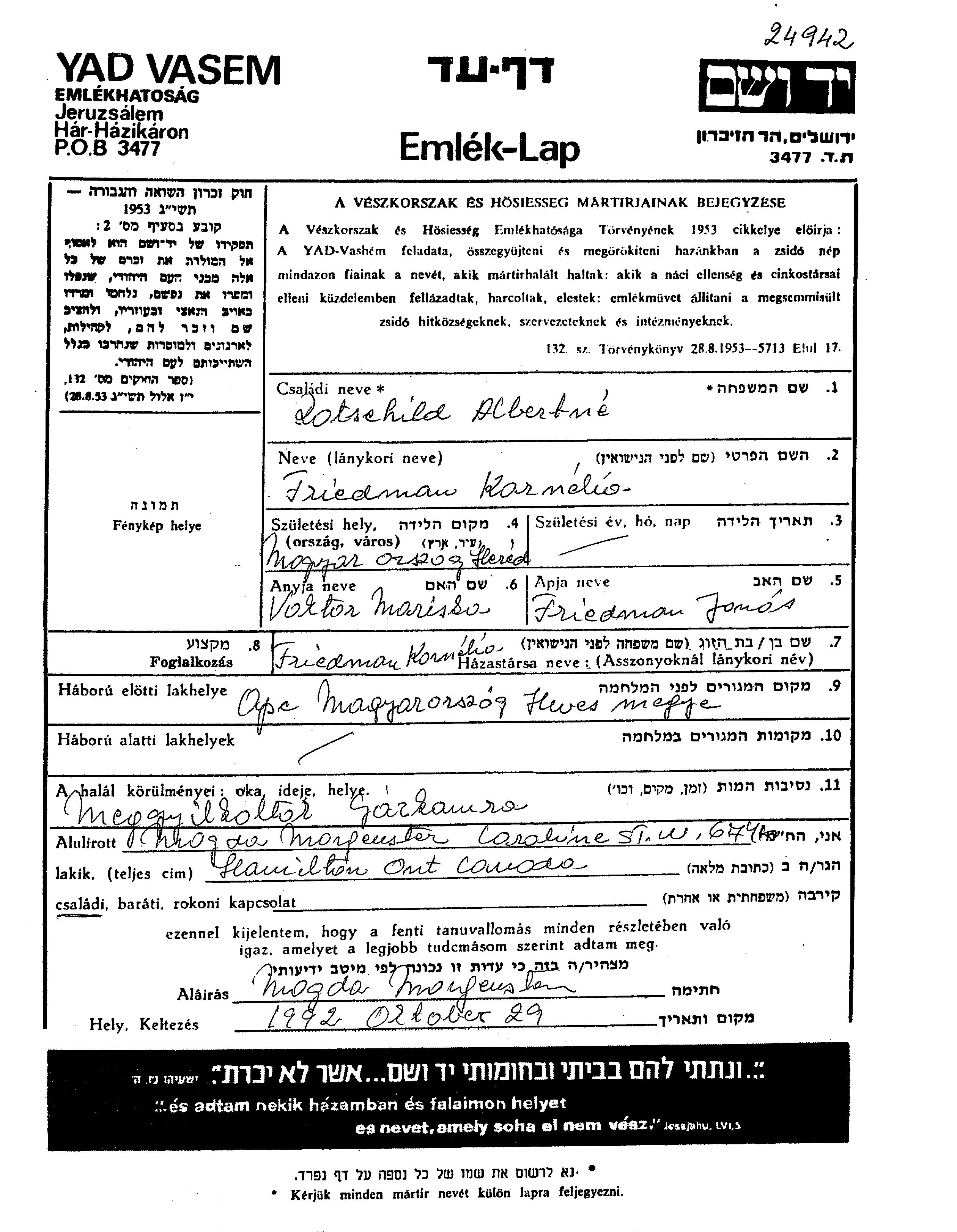 Kornelia Rotschild, geb. Fridman wurde in Hered, Ungarn geboren. Sie war die Tochter von Jonas und Mariska, geb. Vaktor. Sie war mit Albert Verheiratet. Vor dem Zweiten Weltkrieg lebte sie in Heves, Ungarn. Während des Krieges war sie in Heves, Ungarn.