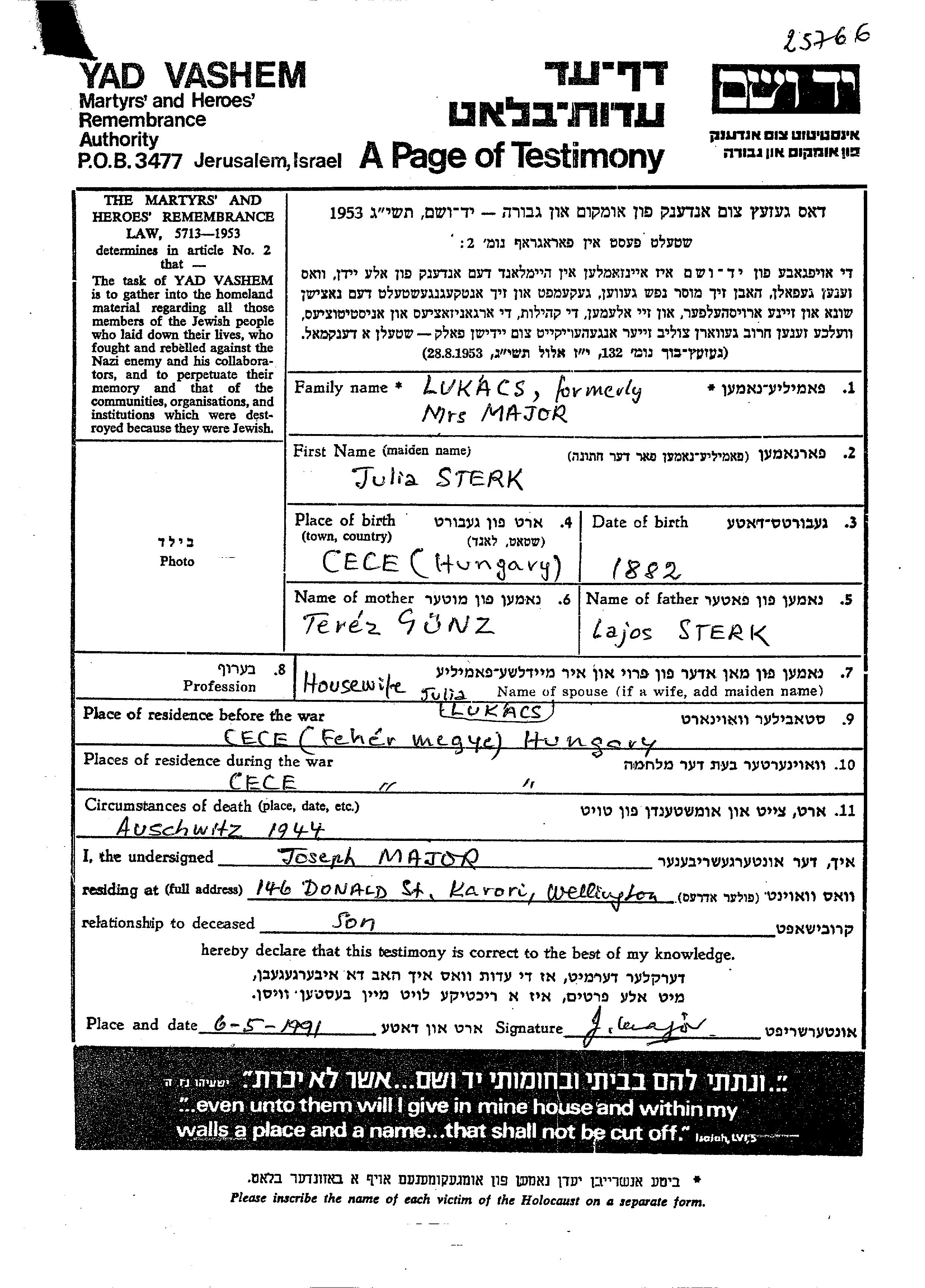 Julia Lukacs, geb. Sterk wurde im Jahr 1882 in Cece, Ungarn geboren. Sie war die Tochter von Lajos und Terez, geb. Guenz. Sie war mit Vilmosh Verheiratet. Vor dem Zweiten Weltkrieg lebte sie in Cece, Ungarn. Während des Krieges war sie in Cece, Ungarn.