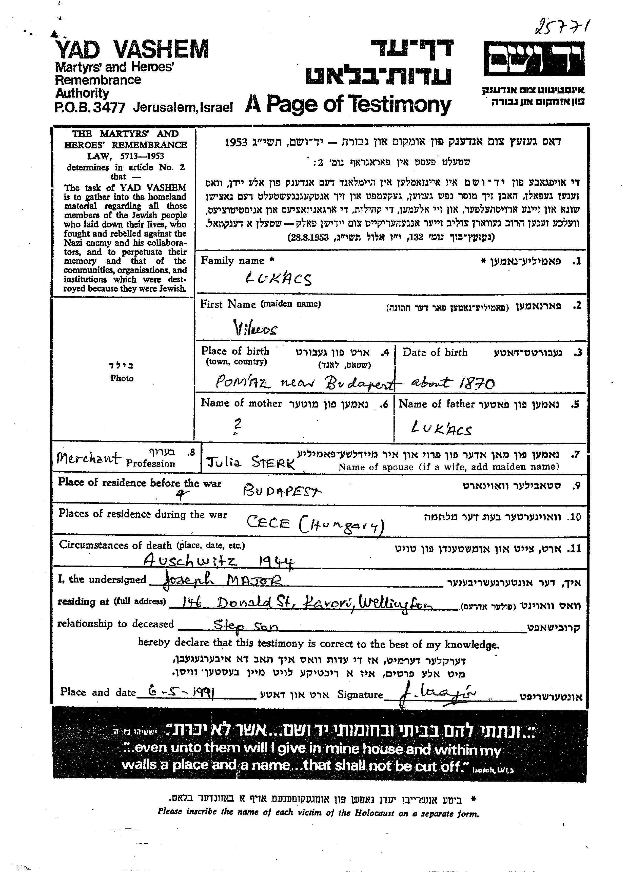 Vilmosh Lukacs wurde im Jahr 1870 in Pomaz, Ungarn geboren. Er war mit Julia Verheiratet. Vor dem Zweiten Weltkrieg lebte er in Budapest, Ungarn. Während des Krieges war er in Cece, Ungarn.