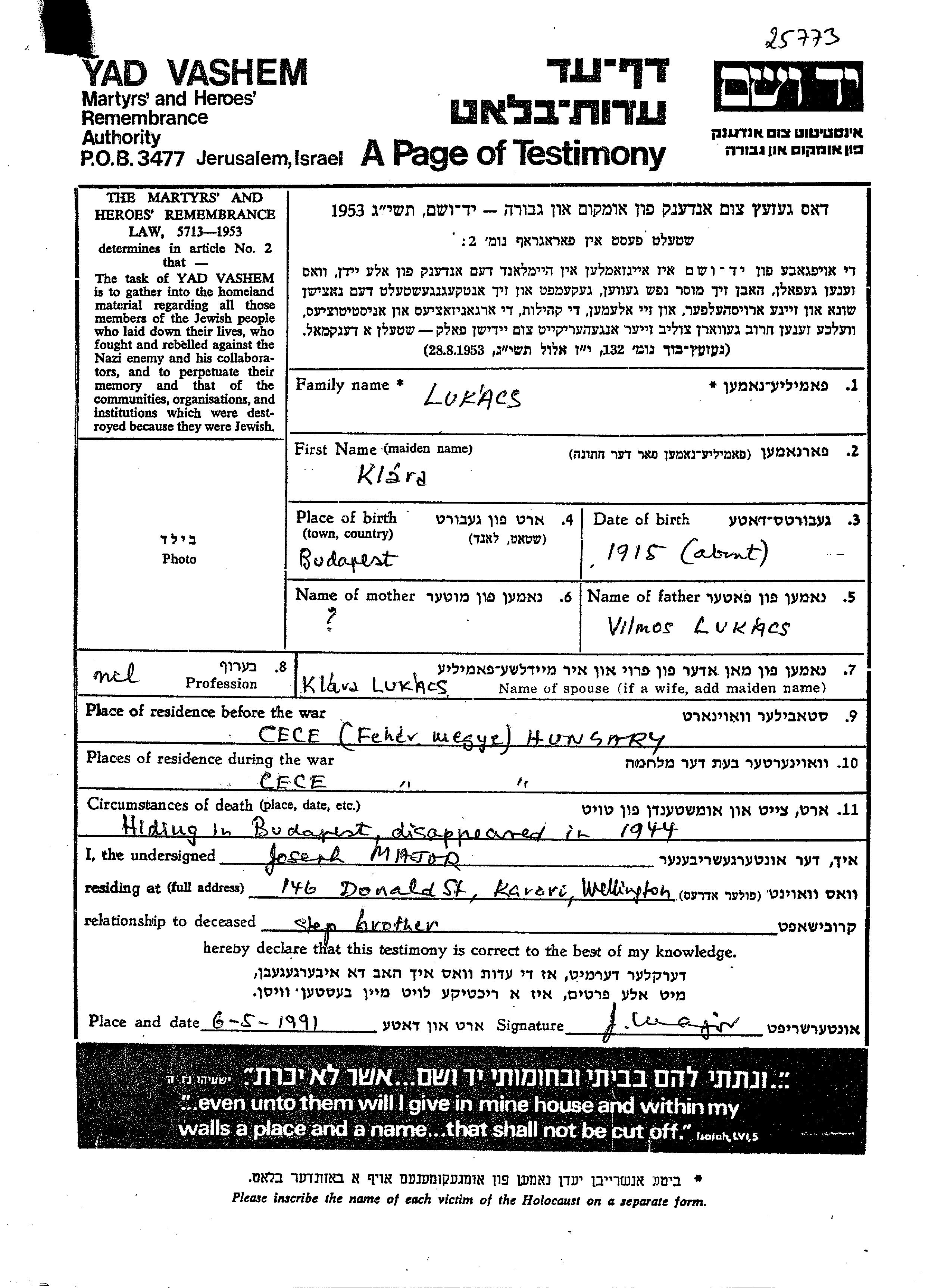 Klara Lukacs wurde im Jahr 1915 in Budapest, Ungarn geboren. Sie war die Tochter von Vilmosh. Vor dem Zweiten Weltkrieg lebte sie in Cece, Ungarn. Während des Krieges war sie in Cece, Ungarn.