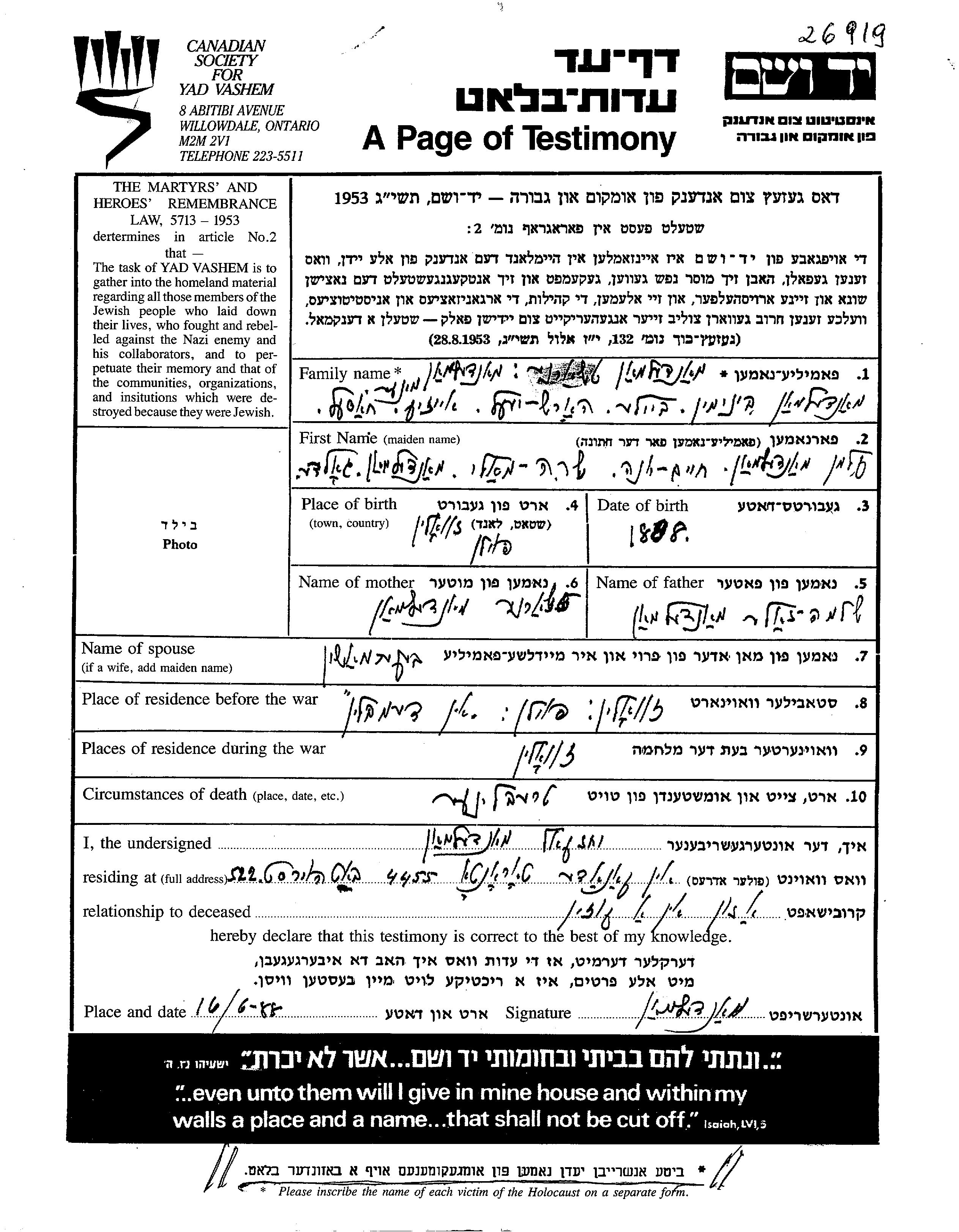 Cerna Mandelman wurde im Jahr 1888 in Zwolin, Polen geboren. Vor dem Zweiten Weltkrieg lebte sie in Zwolin, Polen. Während des Krieges war sie in Zwolin, Polen.