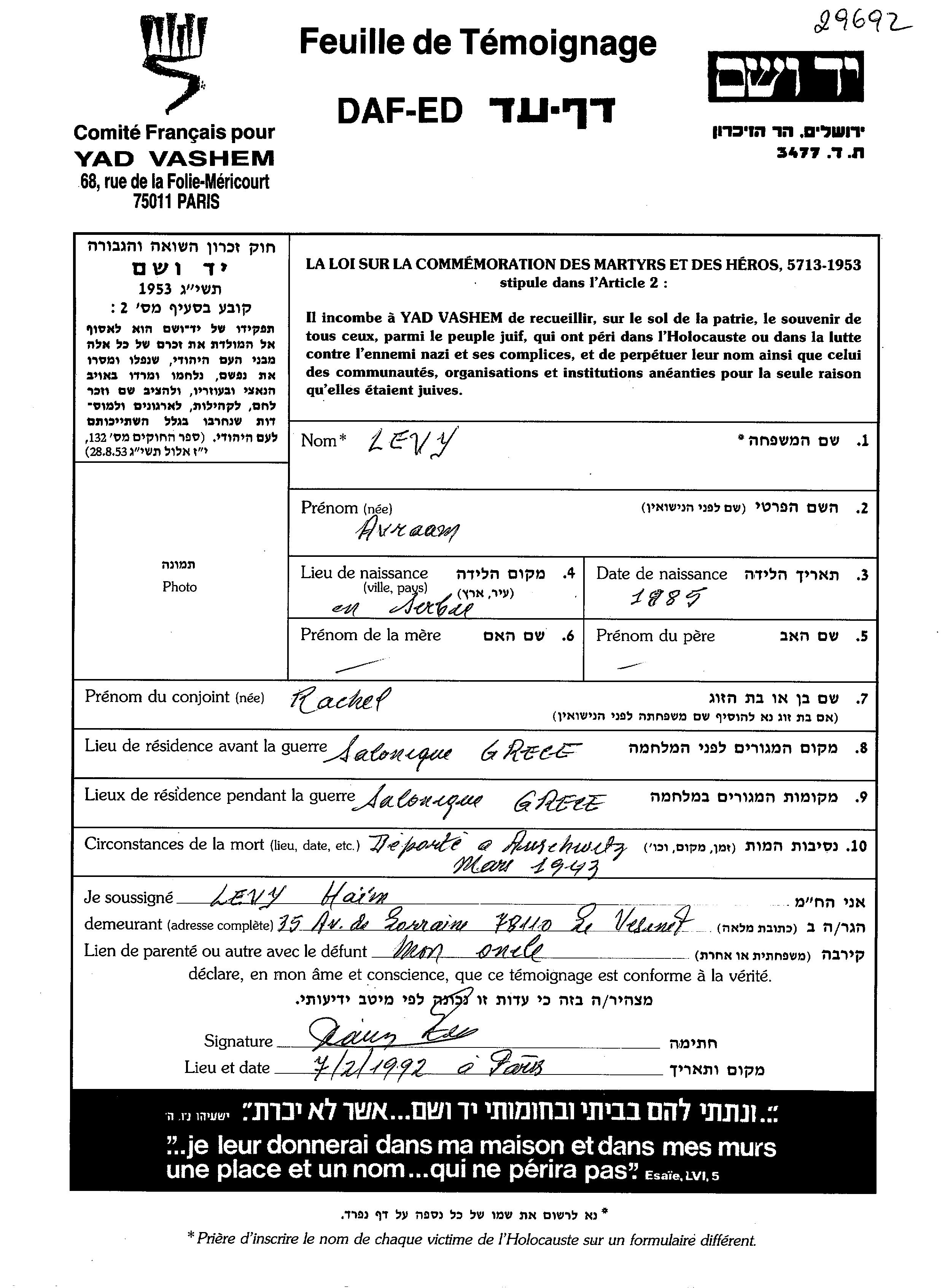 Avraham Levy wurde im Jahr 1885 in Jugoslawien geboren. Er war mit Rachel Verheiratet. Vor dem Zweiten Weltkrieg lebte er in Saloniki, Griechenland. Während des Krieges war er in Saloniki, Griechenland.