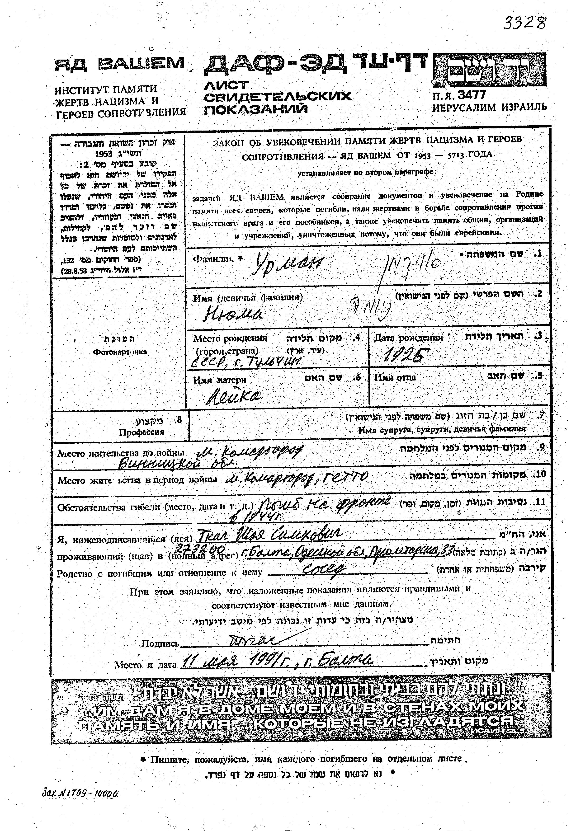 Nyuma Urman wurde im Jahr 1926 in Tulchin, Ukraine (UdSSR) geboren. Er war der Sohn von Leika. Vor dem Zweiten Weltkrieg lebte er in Komargorod, Ukraine (UdSSR). Während des Krieges war er in die Sowjetischen Streitkräfte. Nyuma im Militärdienst umgekommen. Todesort: unbekannt im Jahr 1944.