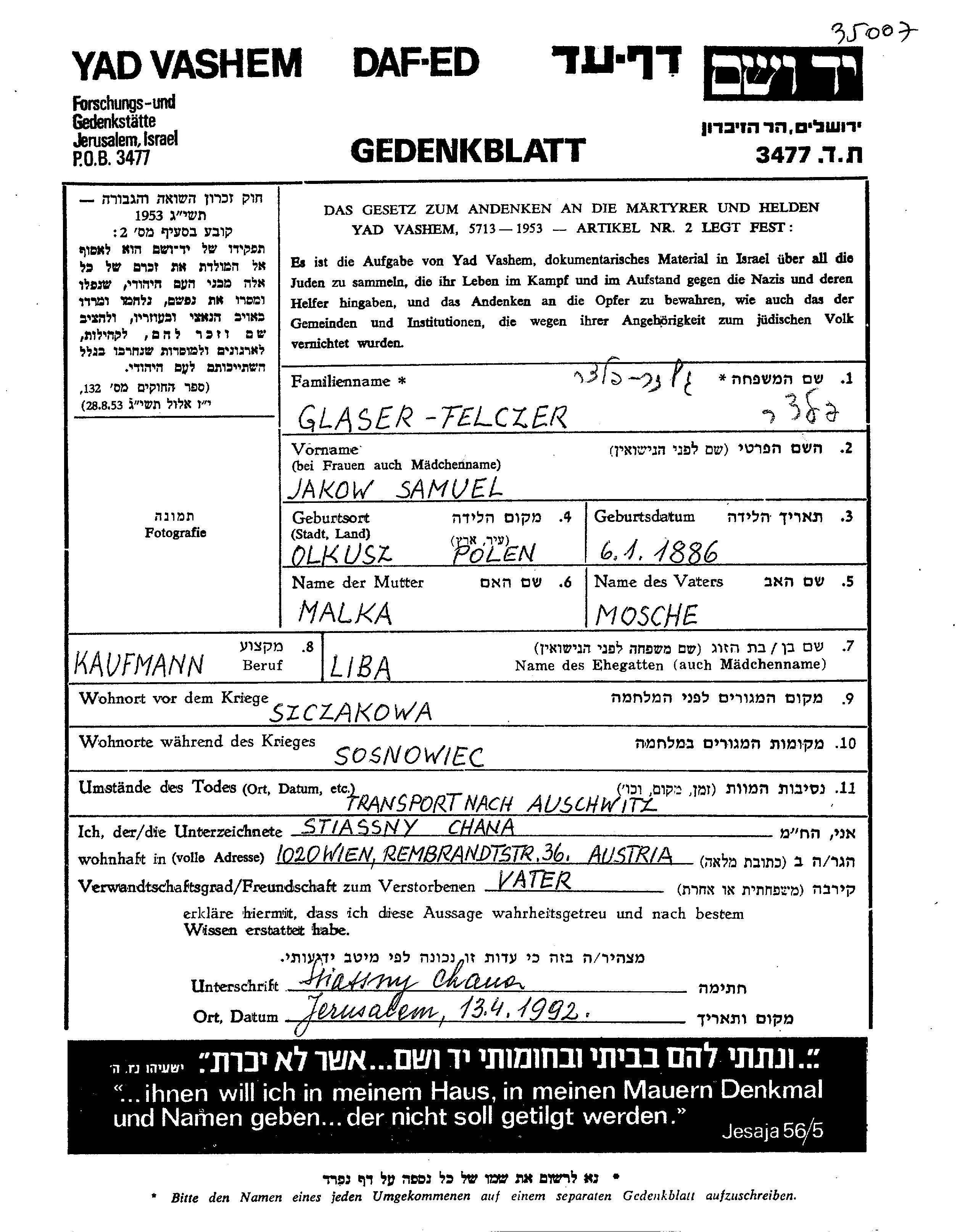 Jakow Samuel Glaser Felczer wurde im Jahr 1886 in Olkusz, Polen geboren. Er war der Sohn von Mosche und Malka, geb. Selinger. Er war Kaufmann/-frau und mit Liba Verheiratet. Vor dem Zweiten Weltkrieg lebte er in Szczakowa, Polen. Während des Krieges war er in Sosnowiec, Polen.