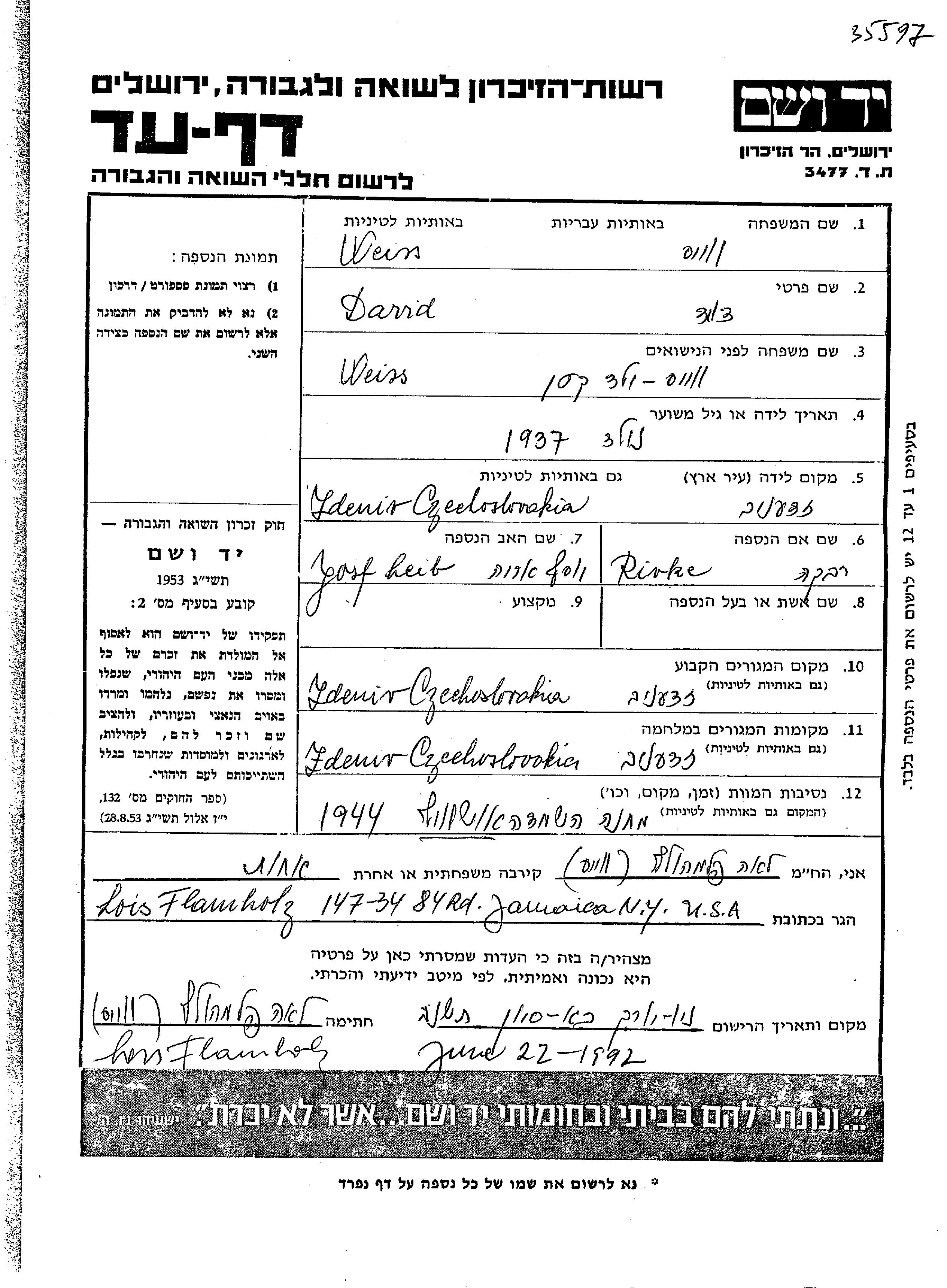 Weiss David 1937 Zdeniv, Tschechoslowakei Gedenkblatt