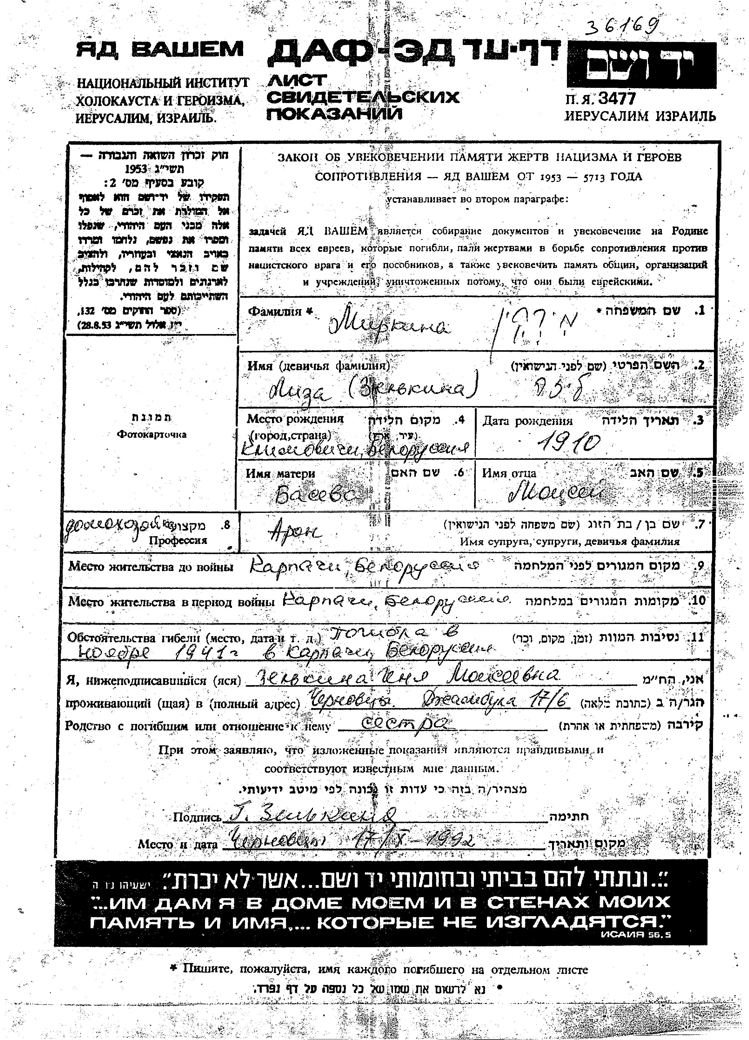 Liza Mirkin, geb. Zalkin wurde im Jahr 1910 in Klimovichi, Weißrussland (UdSSR) geboren. Sie war die Tochter von Moisei und Baseva. Sie war Hausfrau und mit Aron Verheiratet. Vor dem Zweiten Weltkrieg lebte sie in Karpachi, Weißrussland (UdSSR). Während des Krieges war sie in Karpachi, Weißrussland (UdSSR).