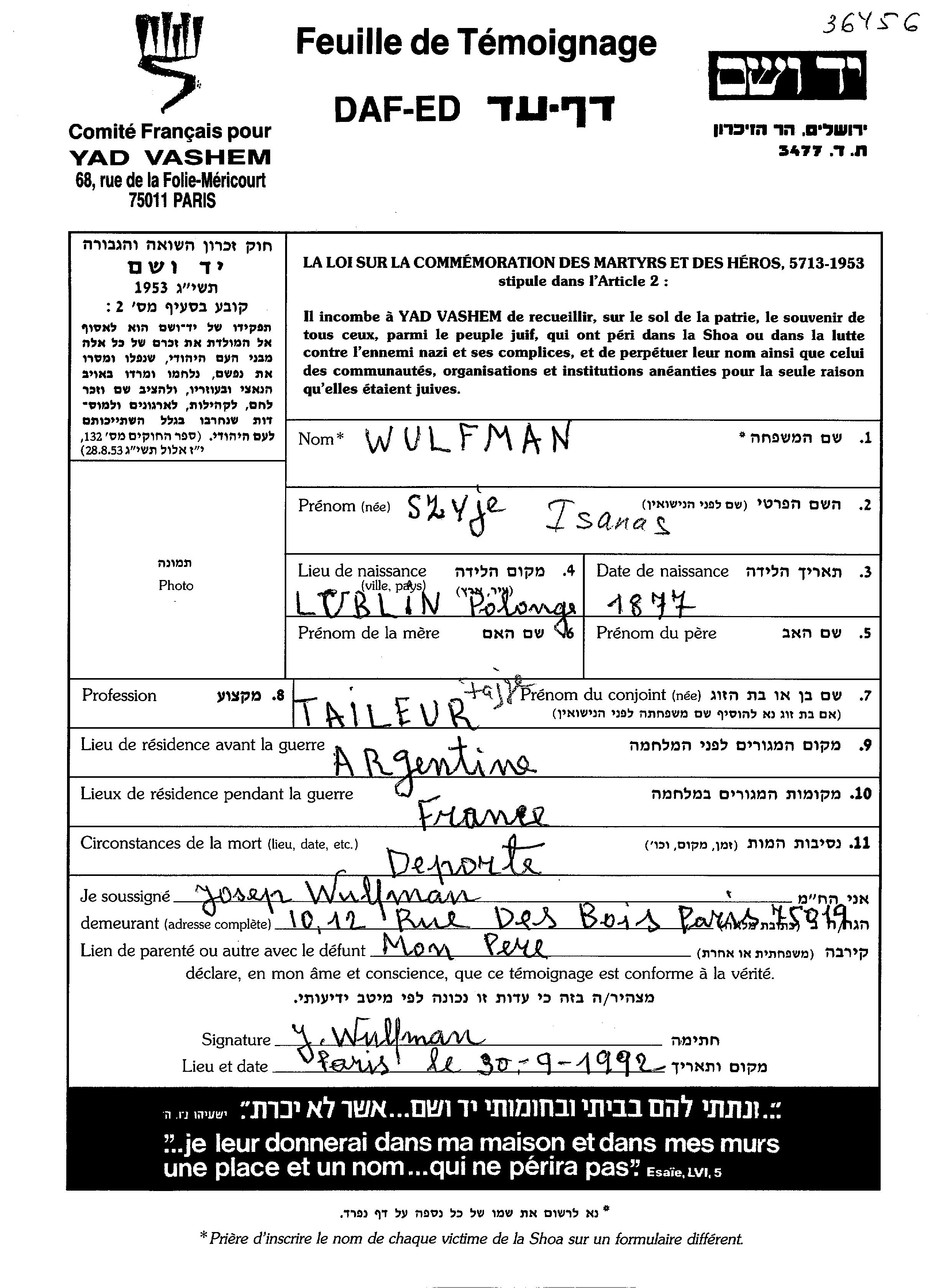 Szyje Shaia Wulfman wurde im Jahr 1877 in Lublin, Polen geboren. Er war Schneider und mit Fajge Verheiratet. Vor dem Zweiten Weltkrieg lebte er in Argentinien. Während des Krieges war er in Frankreich.