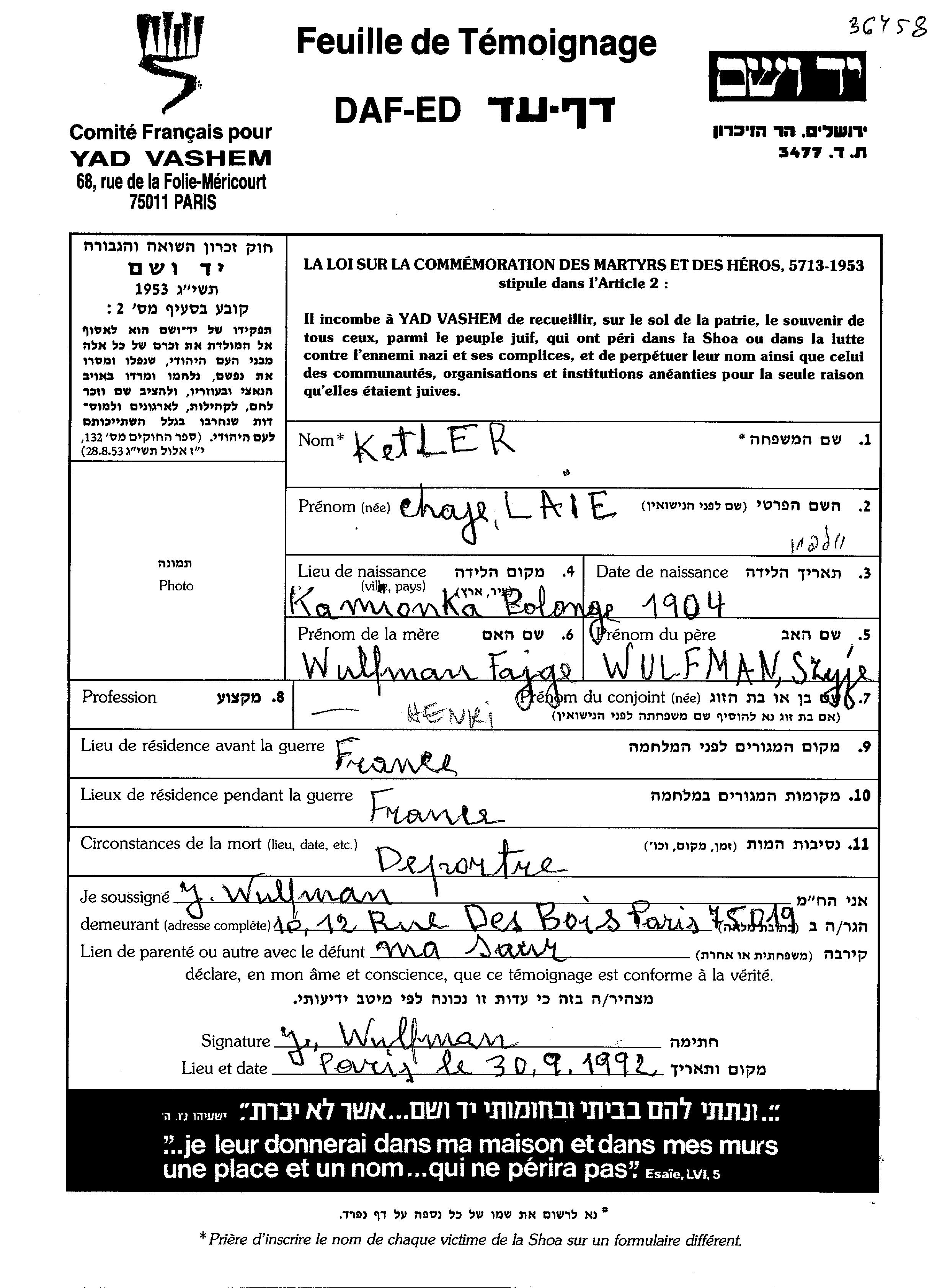 Chaje Laie Ketler, geb. Wulfman wurde im Jahr 1904 in Kamionka, Polen geboren. Sie war die Tochter von Szyje Shaia und Fajga. Sie war mit Henri Verheiratet. Vor dem Zweiten Weltkrieg lebte sie in Frankreich. Während des Krieges war sie in Frankreich.
