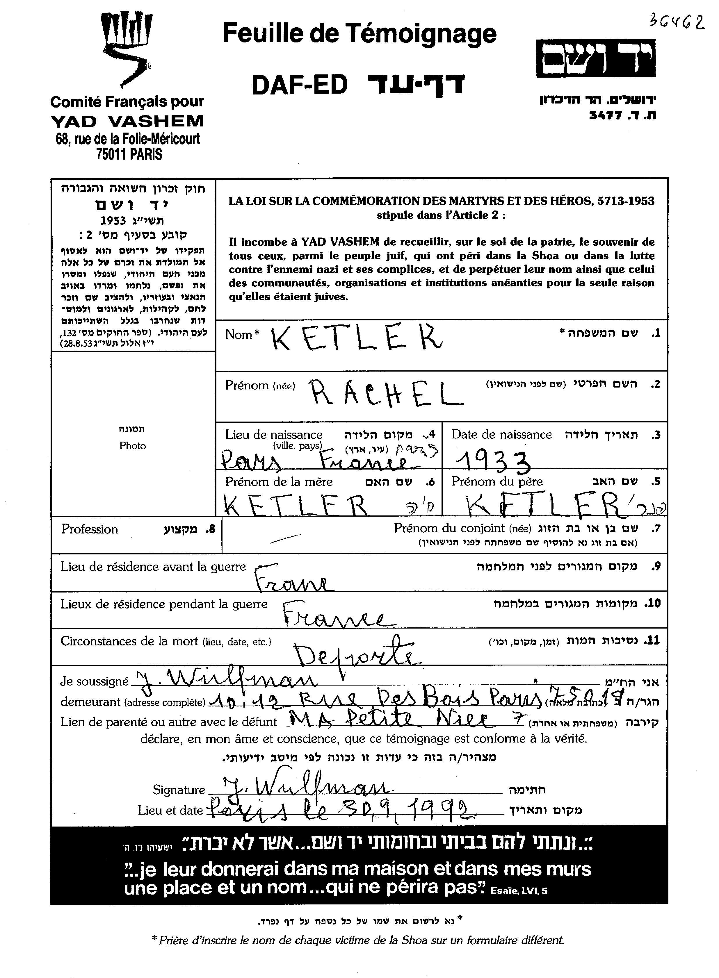 Ketler Rachel 1933 Frankreich Gedenkblatt