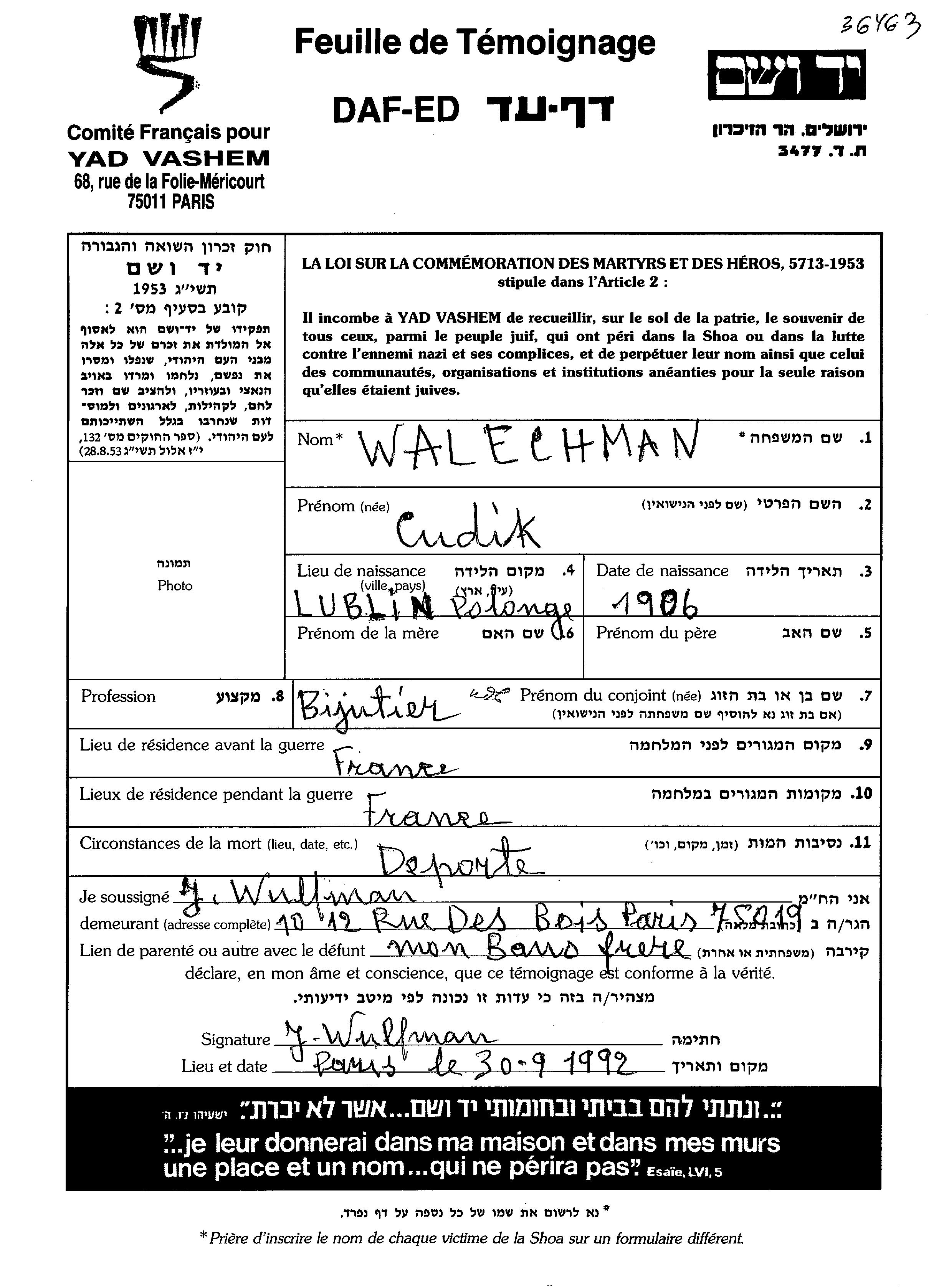 Cudik Walechman Valakhman wurde im Jahr 1906 in Lublin, Polen geboren. Er war Goldschmied/-in. Vor dem Zweiten Weltkrieg lebte er in Frankreich. Während des Krieges war er in Frankreich.