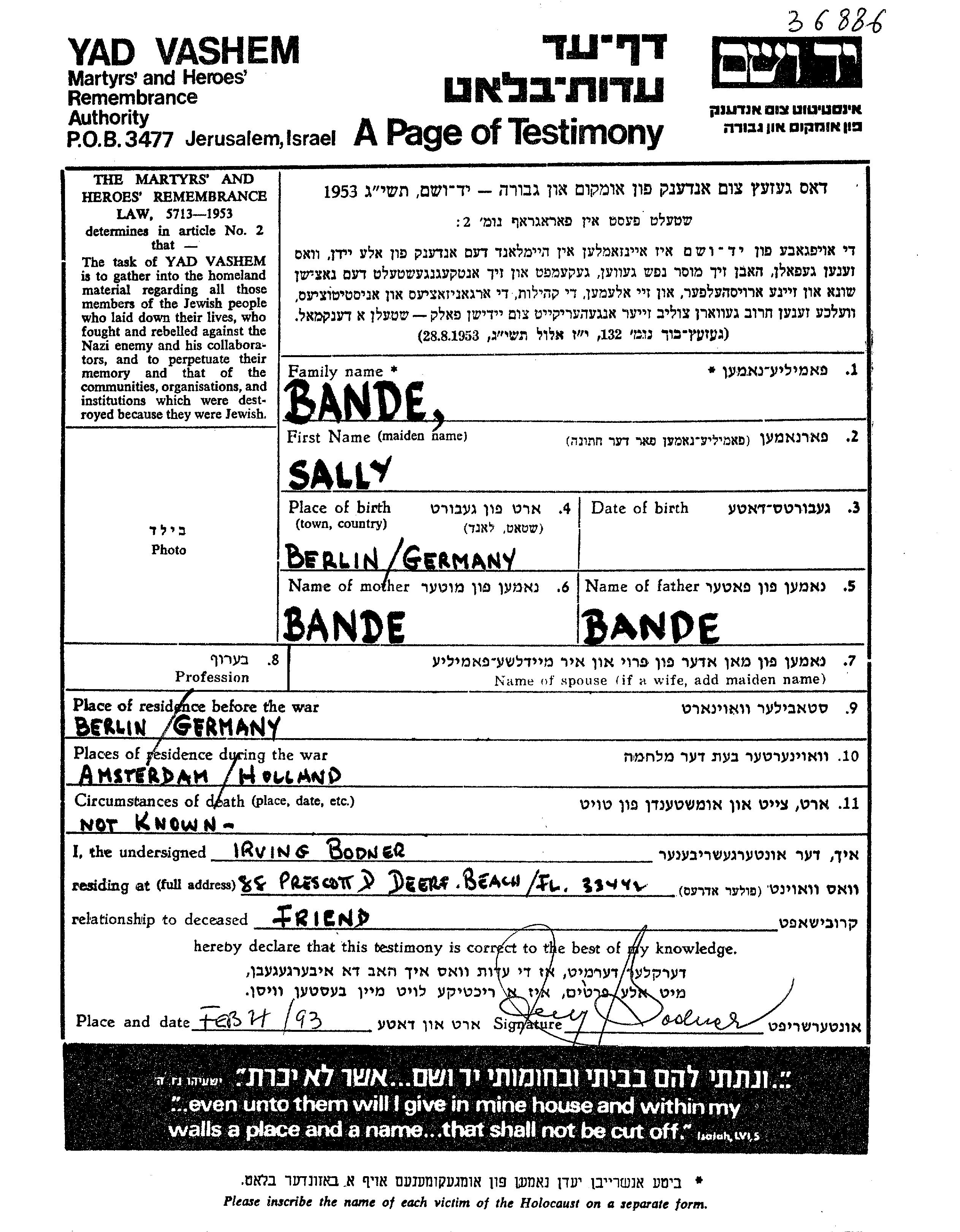 Sally Bande wurde in Berlin, Deutsches Reich geboren. Vor dem Zweiten Weltkrieg lebte sie in Berlin, Deutsches Reich. Während des Krieges war sie in Amsterdam, Niederlande.