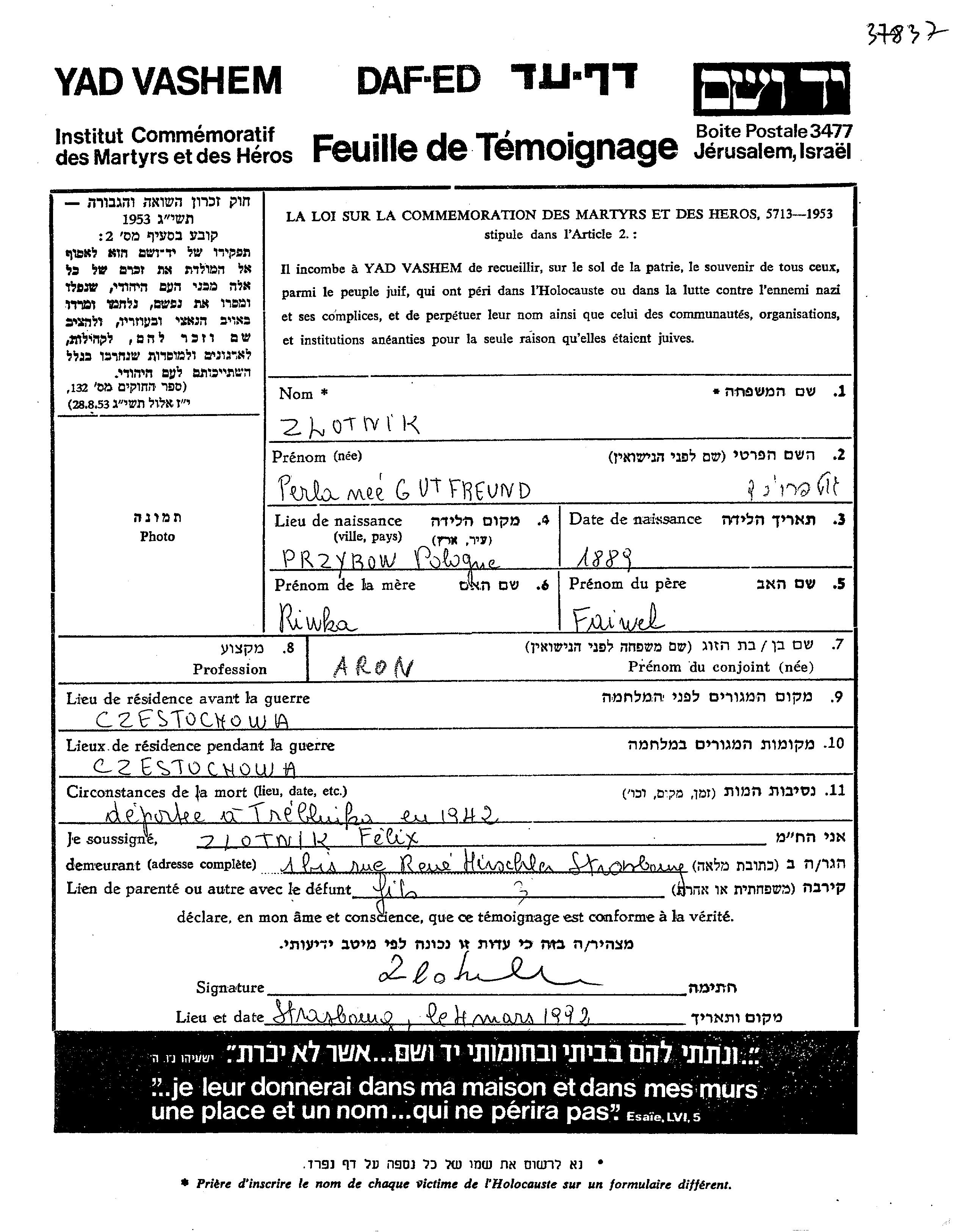 Perla Zlotnik, geb. Gutfreund wurde im Jahr 1889 in Przyrow, Polen geboren. Sie war die Tochter von Faiwel und Riwka. Sie war mit Aron Verheiratet. Vor dem Zweiten Weltkrieg lebte sie in Czestochowa, Polen. Während des Krieges war sie in Czestochowa, Polen.