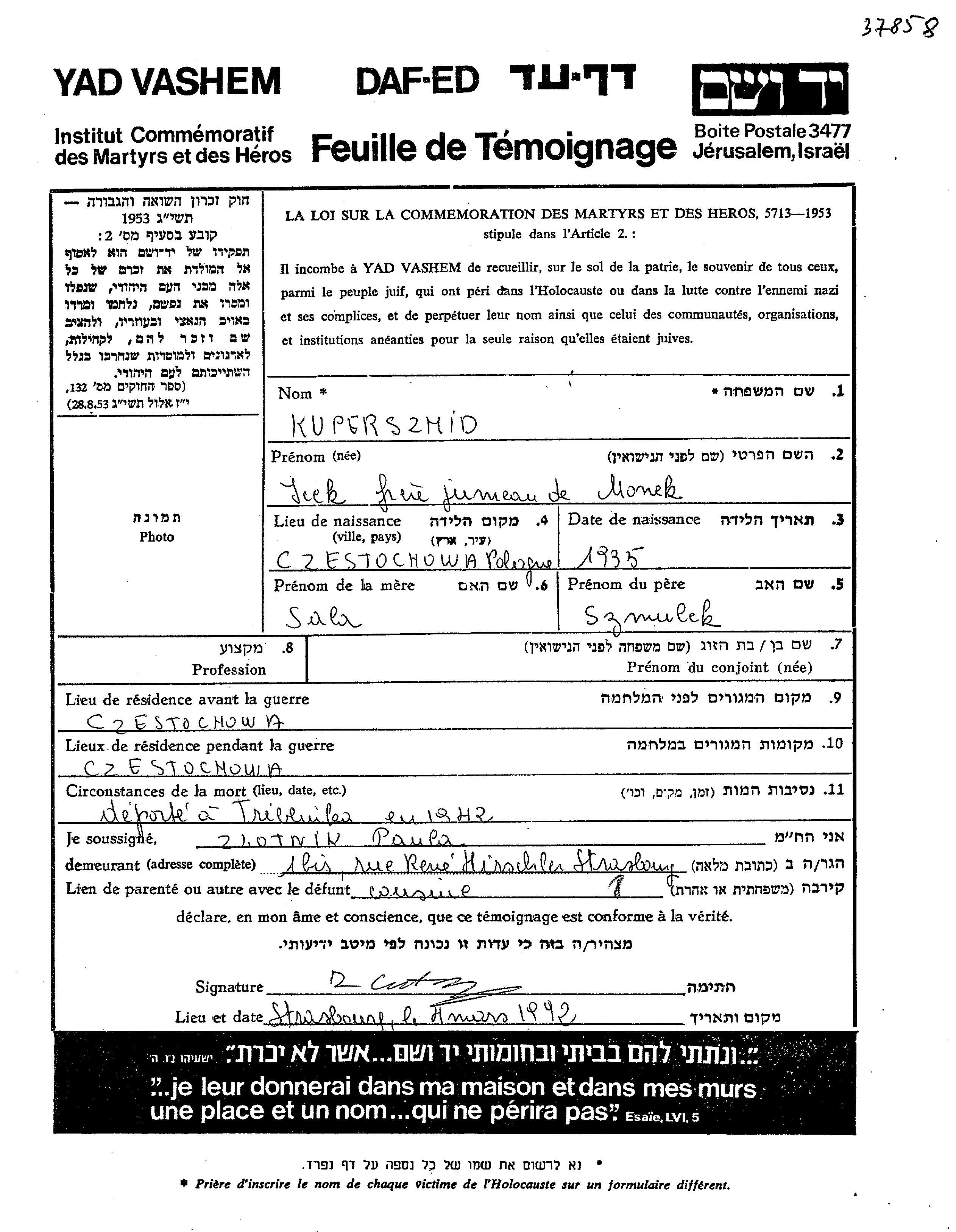 Icek Kuperszmid wurde im Jahr 1935 in Czestochowa, Polen geboren. Er war der Sohn von Szmulek und Sala, geb. Wekstein. Er war Kind. Vor dem Zweiten Weltkrieg lebte er in Czestochowa, Polen. Während des Krieges war er in Czestochowa, Polen.