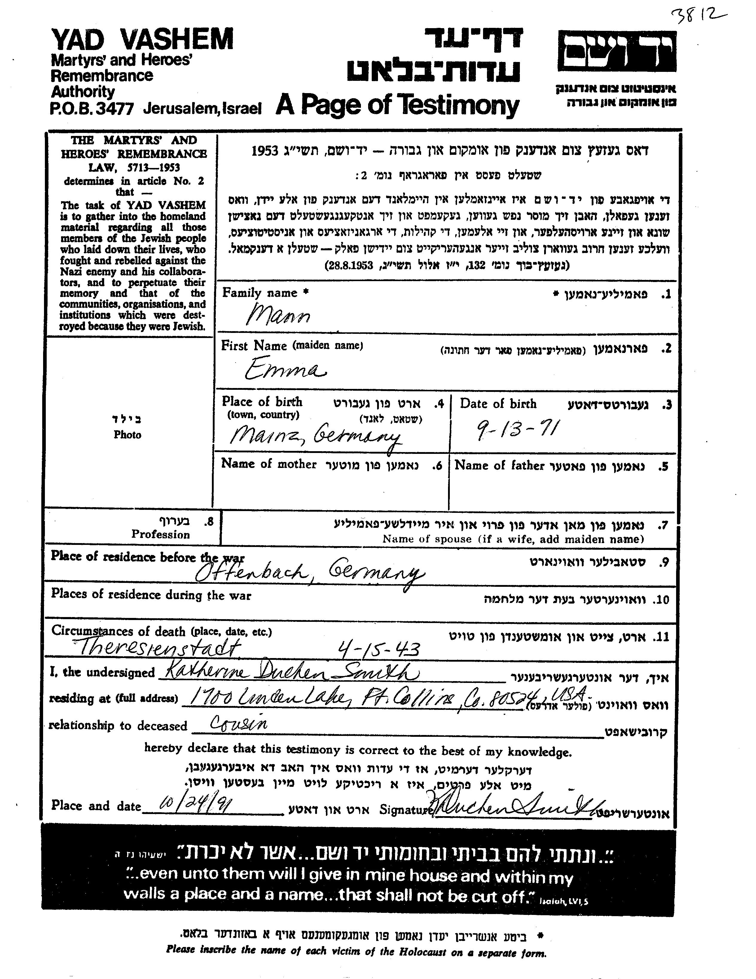Emma wurde in der Schoah ermordet. Todesort: Theresienstadt, Tschechoslowakei im Jahr 15/04/1943.