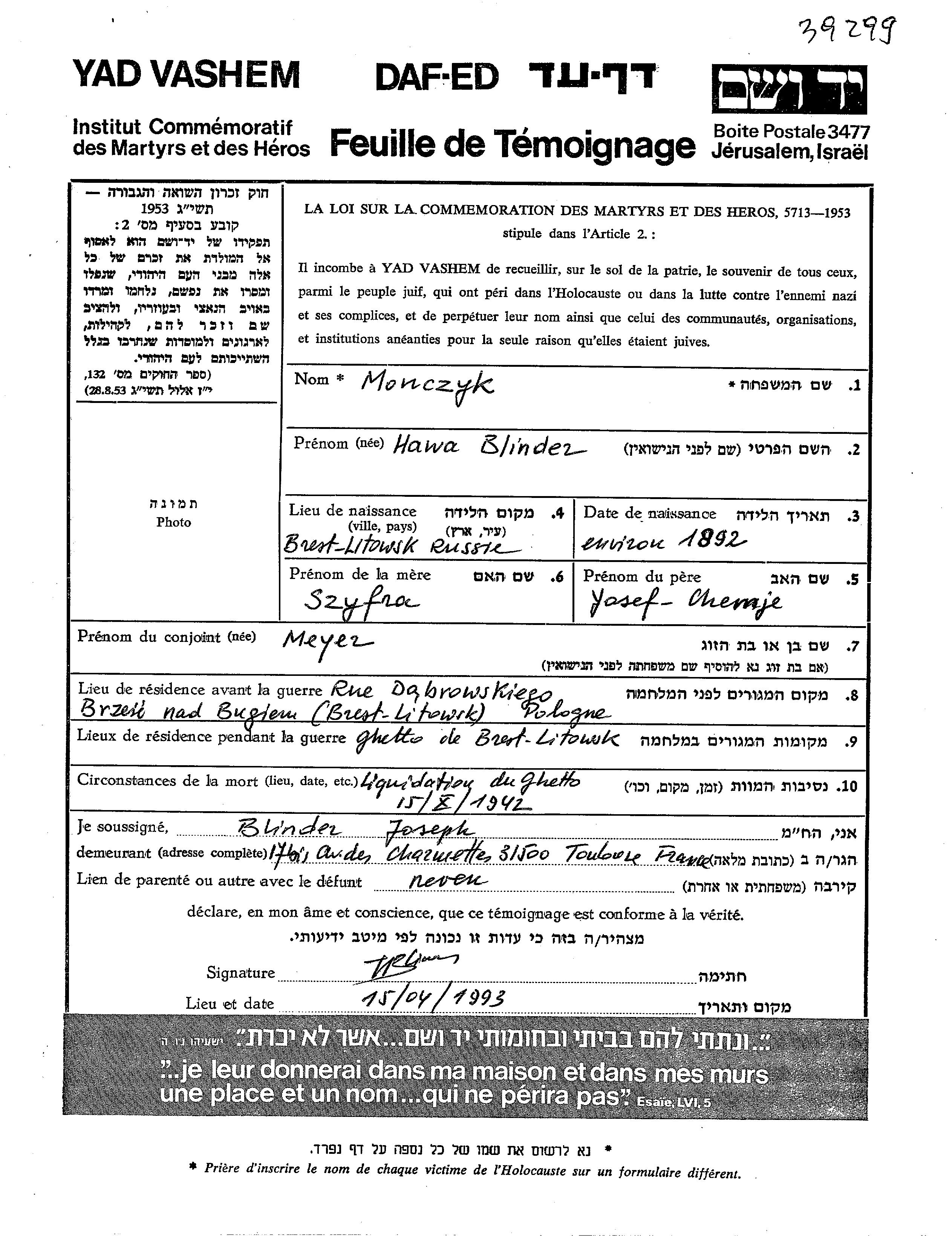 Hawa Monczyk, geb. Blinder wurde im Jahr 1892 in Brest Litowsk, Polen geboren. Sie war die Tochter von Josef Chemje und Szyfra, geb. Jalowski. Sie war mit Meyer Verheiratet. Vor dem Zweiten Weltkrieg lebte sie in Brest Litowsk, Polen. Während des Krieges war sie in Brest Litowsk, Polen.