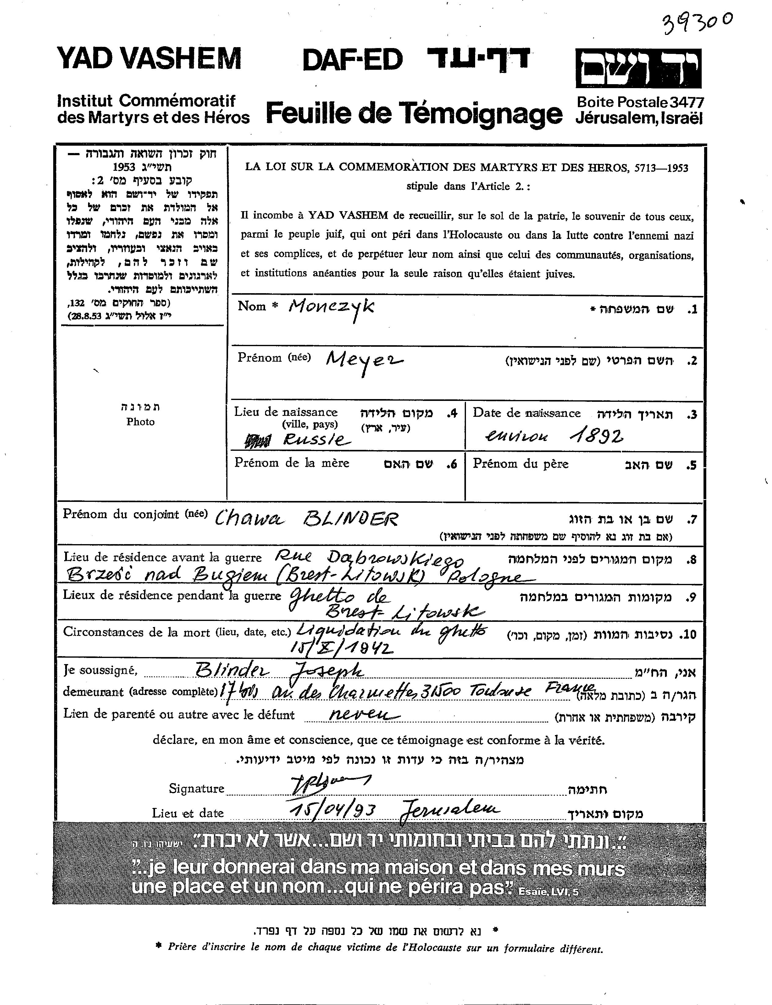 Meyer Monczyk wurde im Jahr 1892 in Russland (UdSSR) geboren. Er war mit Chawa Verheiratet. Vor dem Zweiten Weltkrieg lebte er in Brest Litowsk, Polen. Während des Krieges war er in Brest Litowsk, Polen.