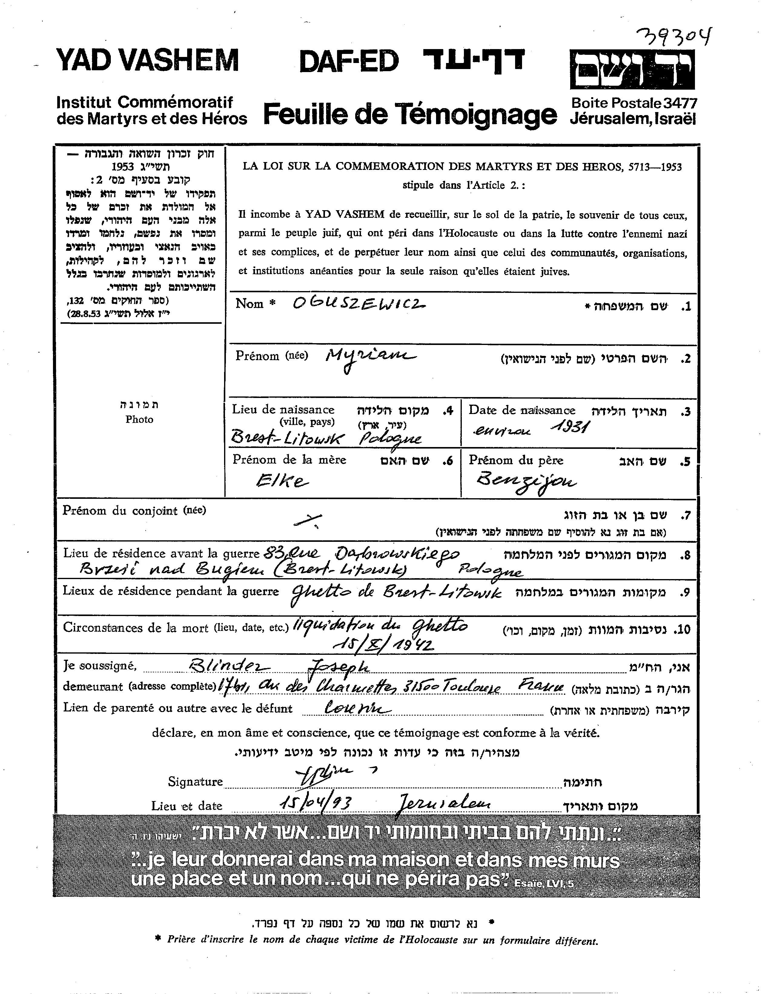 Oguszewicz Myriam 1931 Brest Litowsk, Polen Gedenkblatt