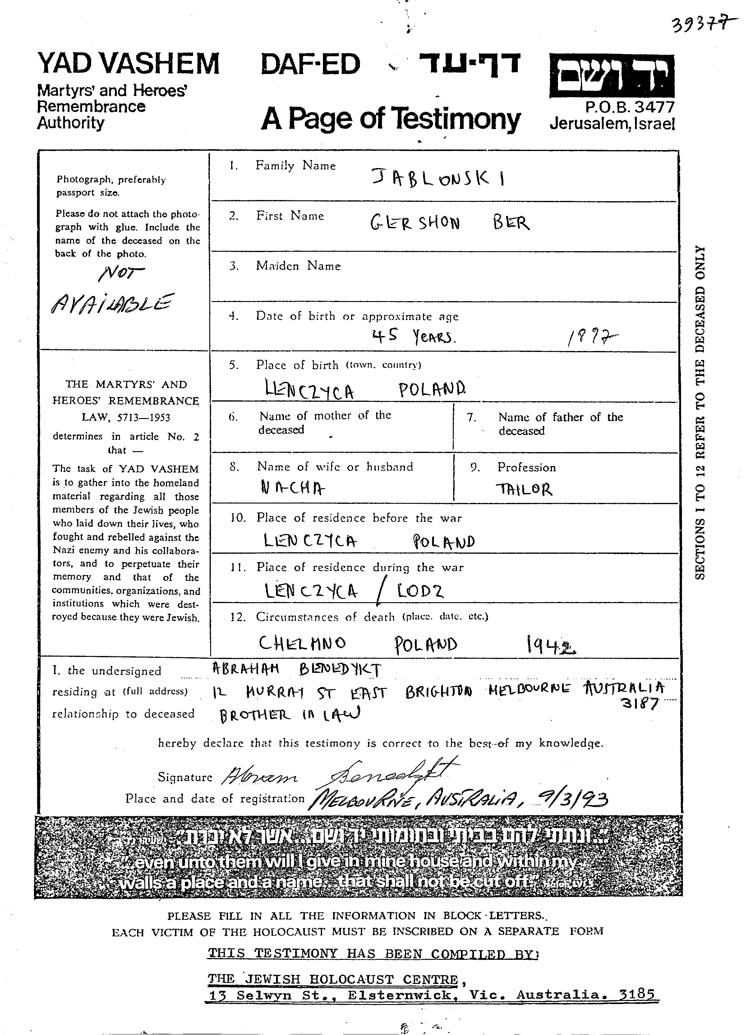 Ber Gershon Jablonski wurde im Jahr 1897 in Leczyca, Polen geboren. Er war Schneider und mit Necha Verheiratet. Vor dem Zweiten Weltkrieg lebte er in Leczyca, Polen. Während des Krieges war er in Leczyca, Polen.