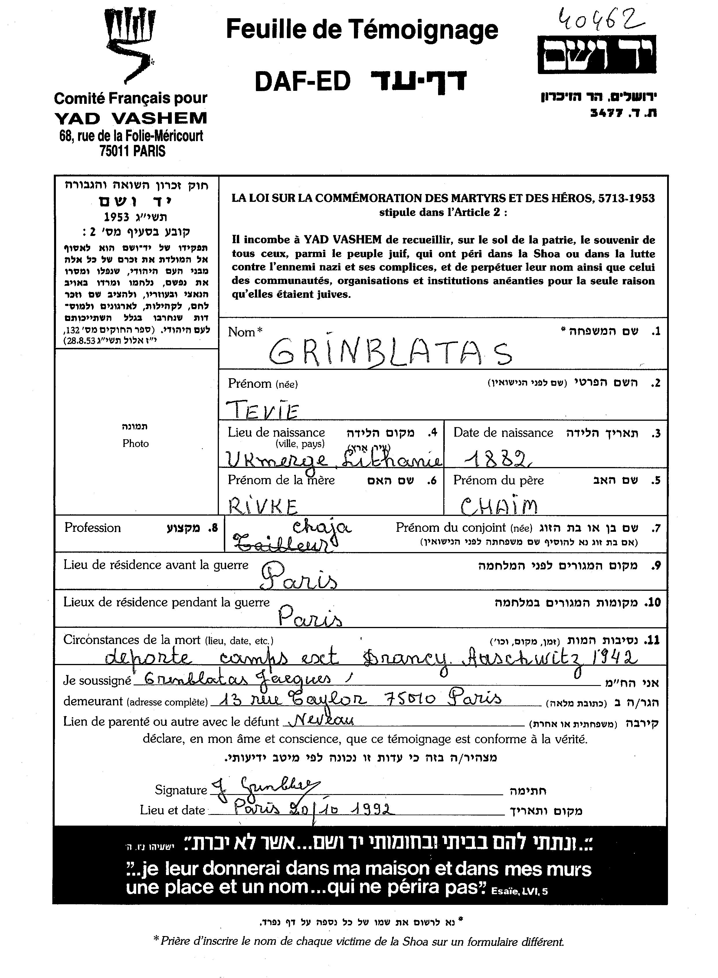 Grinblatas Tevie 1882 Paris, Frankreich Gedenkblatt
