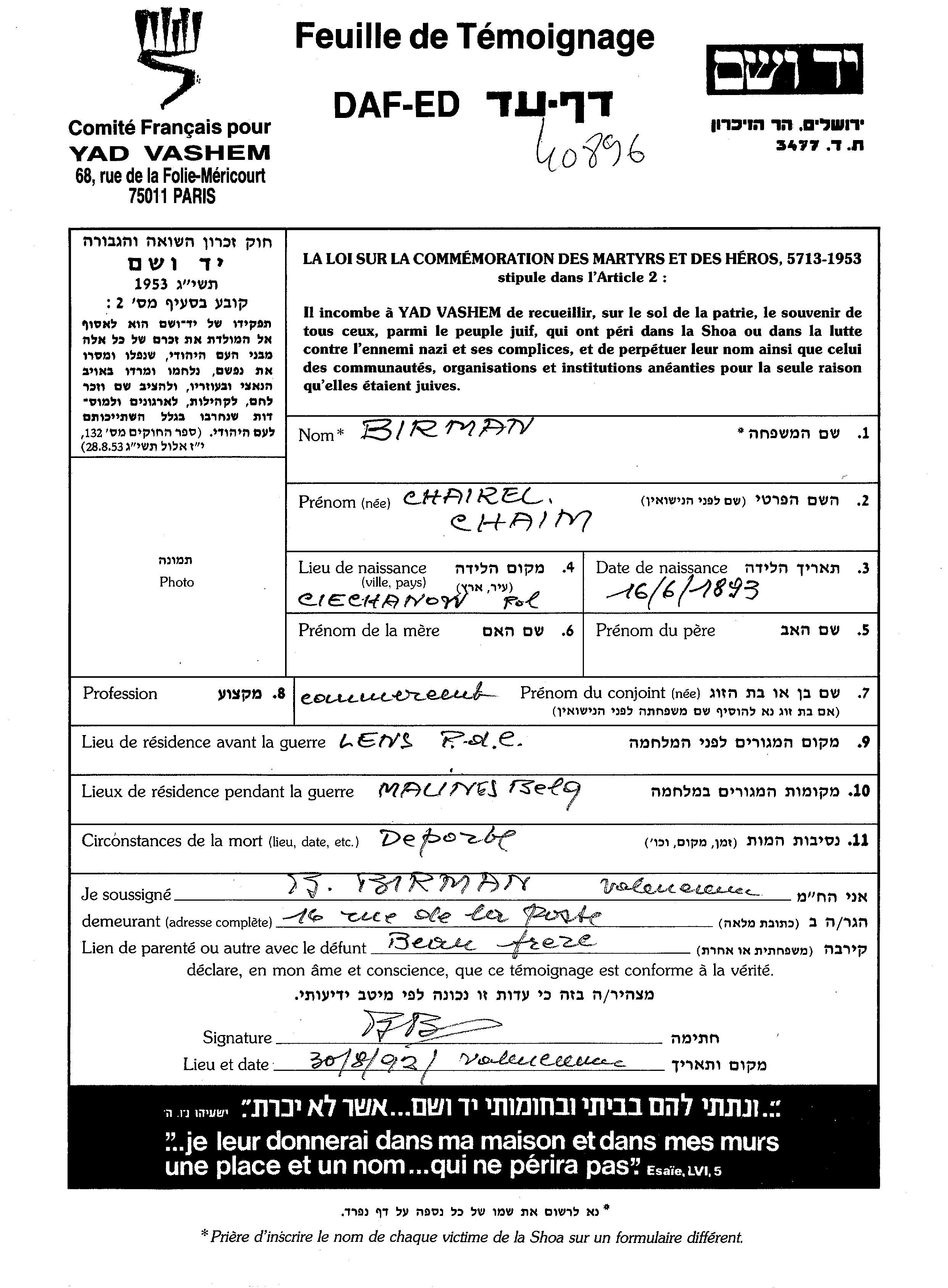 Chaim Birman wurde im Jahr 1893 in Ciechanow, Polen geboren. Er war Kaufmann/-frau. Vor dem Zweiten Weltkrieg lebte er in Lens, Frankreich.