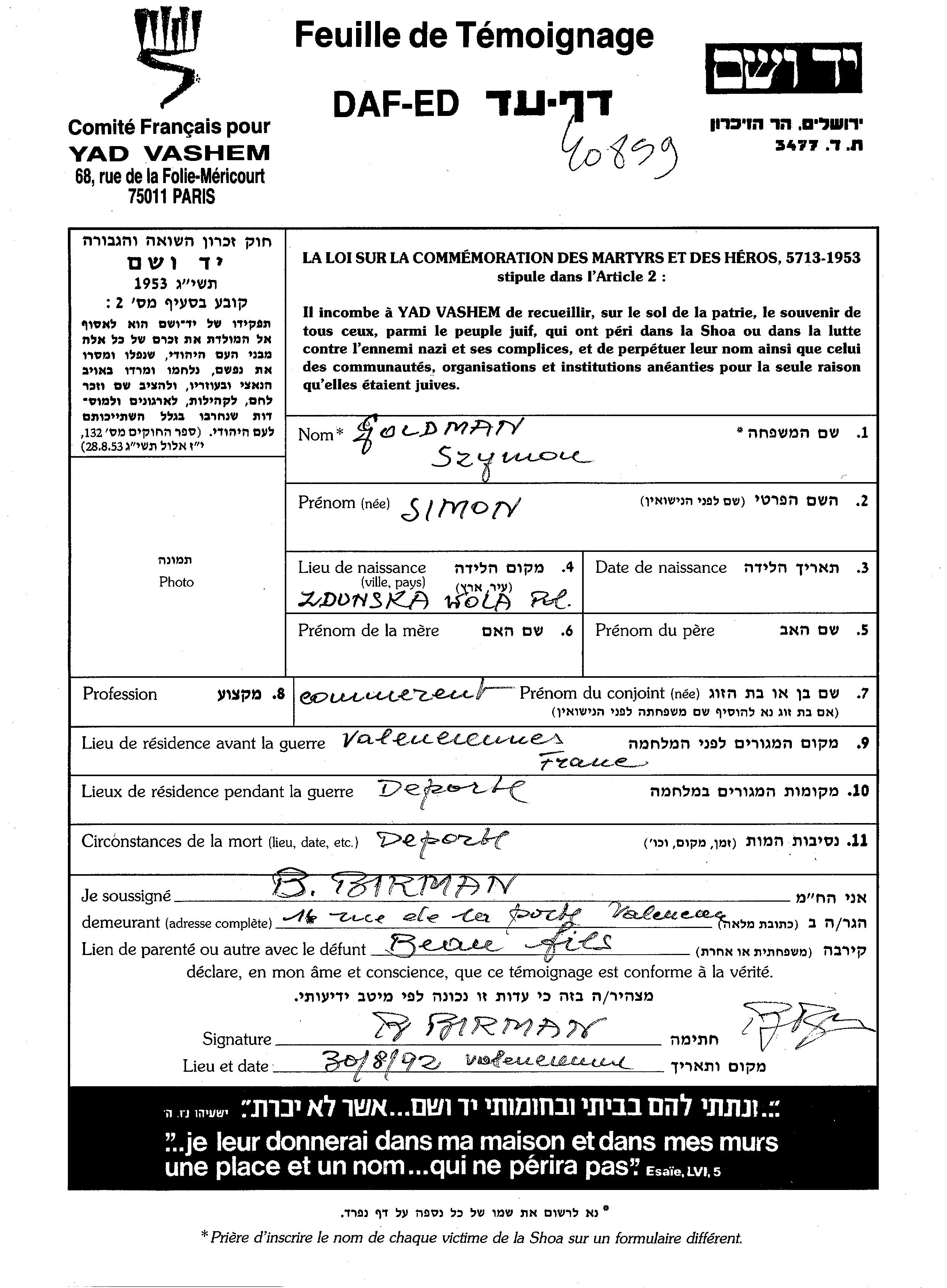 Szymon Goldman wurde in Zdunska Wola, Polen geboren. Er war Kaufmann/-frau. Vor dem Zweiten Weltkrieg lebte er in Valenciennes, Frankreich.