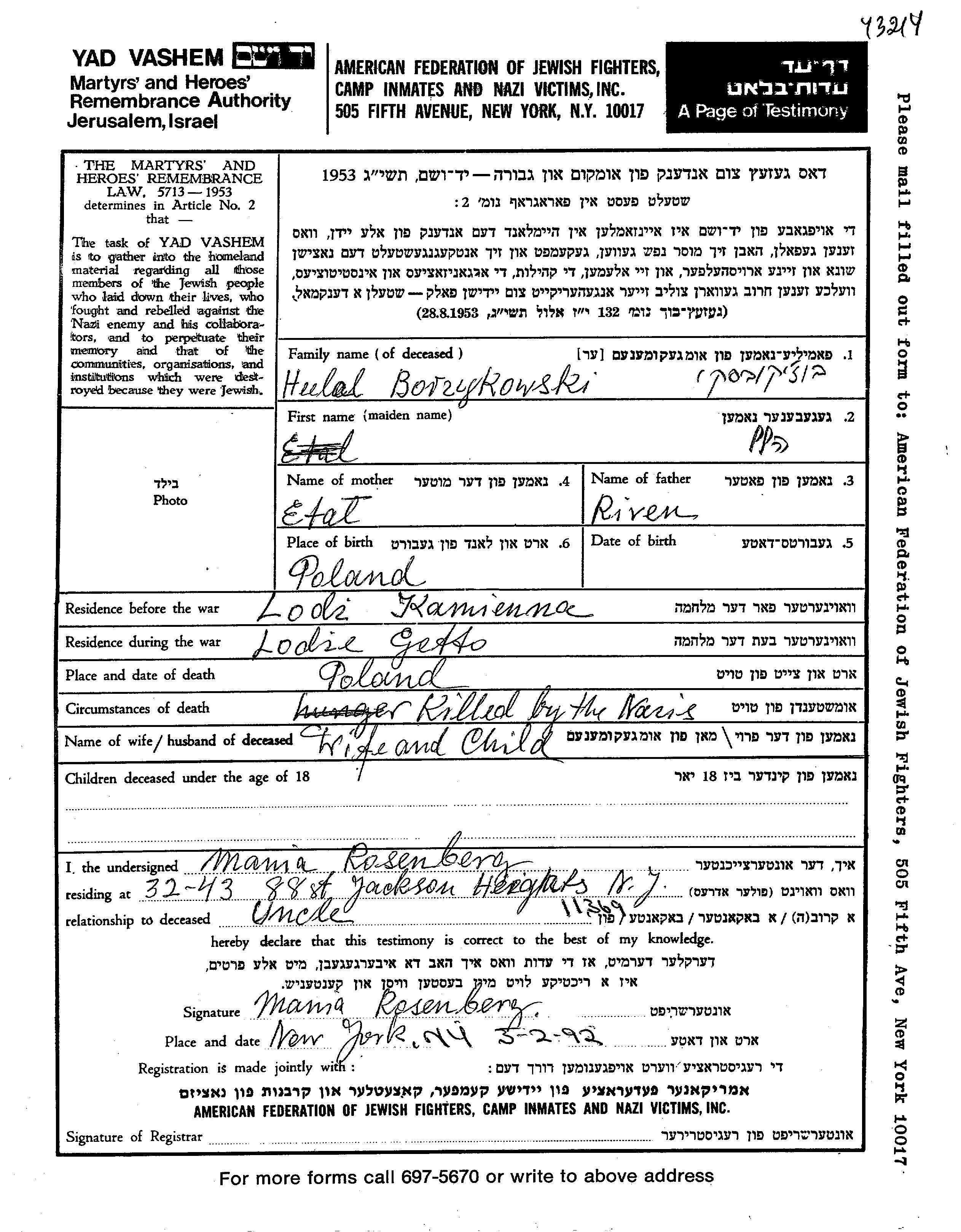 Borzykowski Hilel Lodz, Polen Gedenkblatt