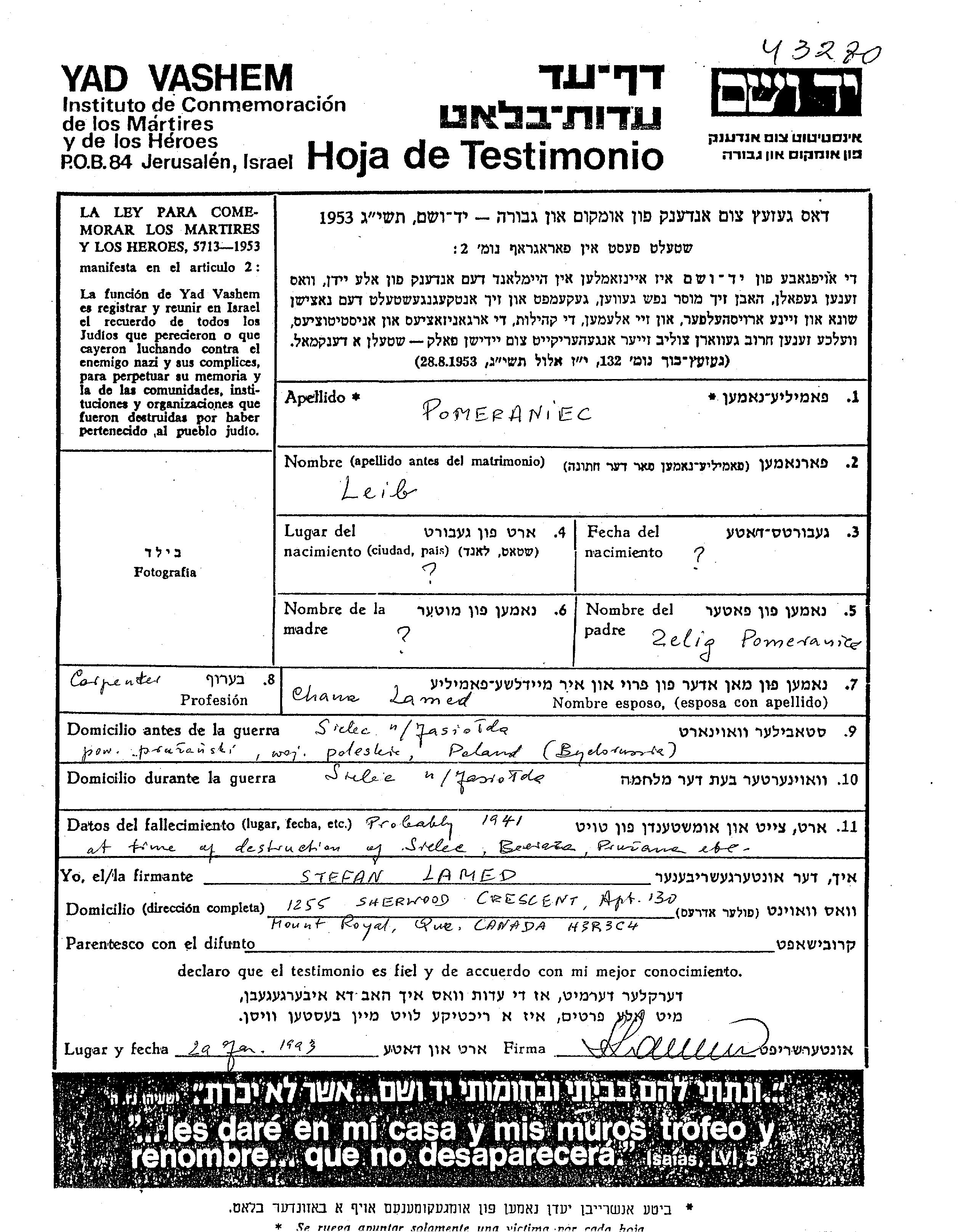 Leib Pomeraniec wurde Er war der Sohn von Zelig. Er war Zimmermann und mit Chana Verheiratet. Vor dem Zweiten Weltkrieg lebte er in Sielec, Polen. Während des Krieges war er in Sielec, Polen.