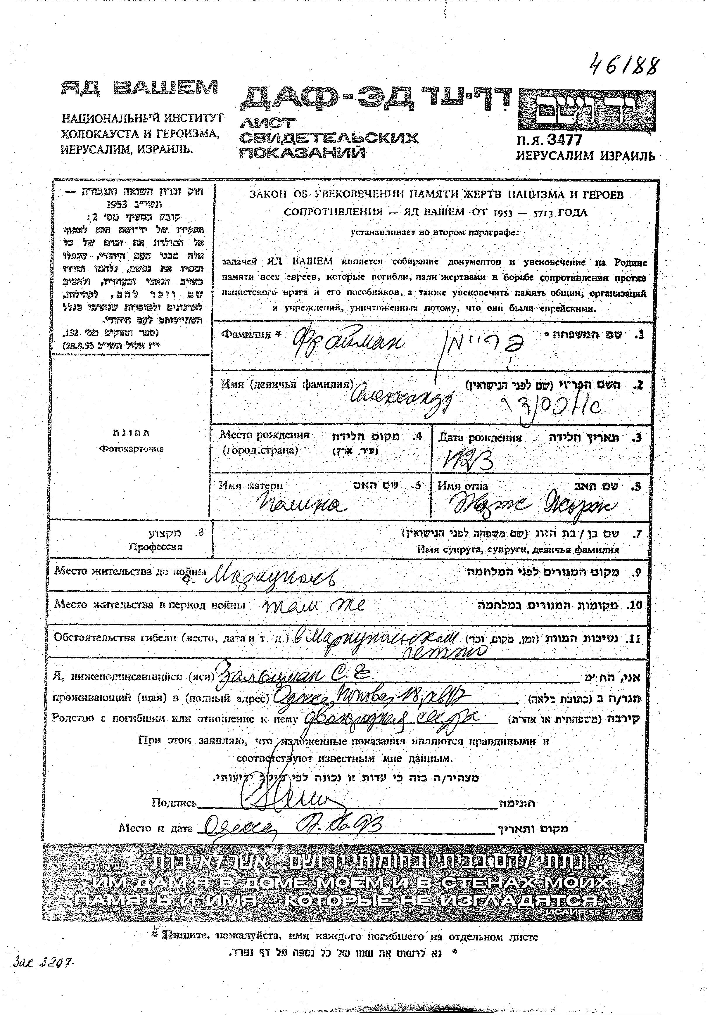 Frayman Aleksandr 1923 Mariupol, Ukraine (UdSSR) Gedenkblatt