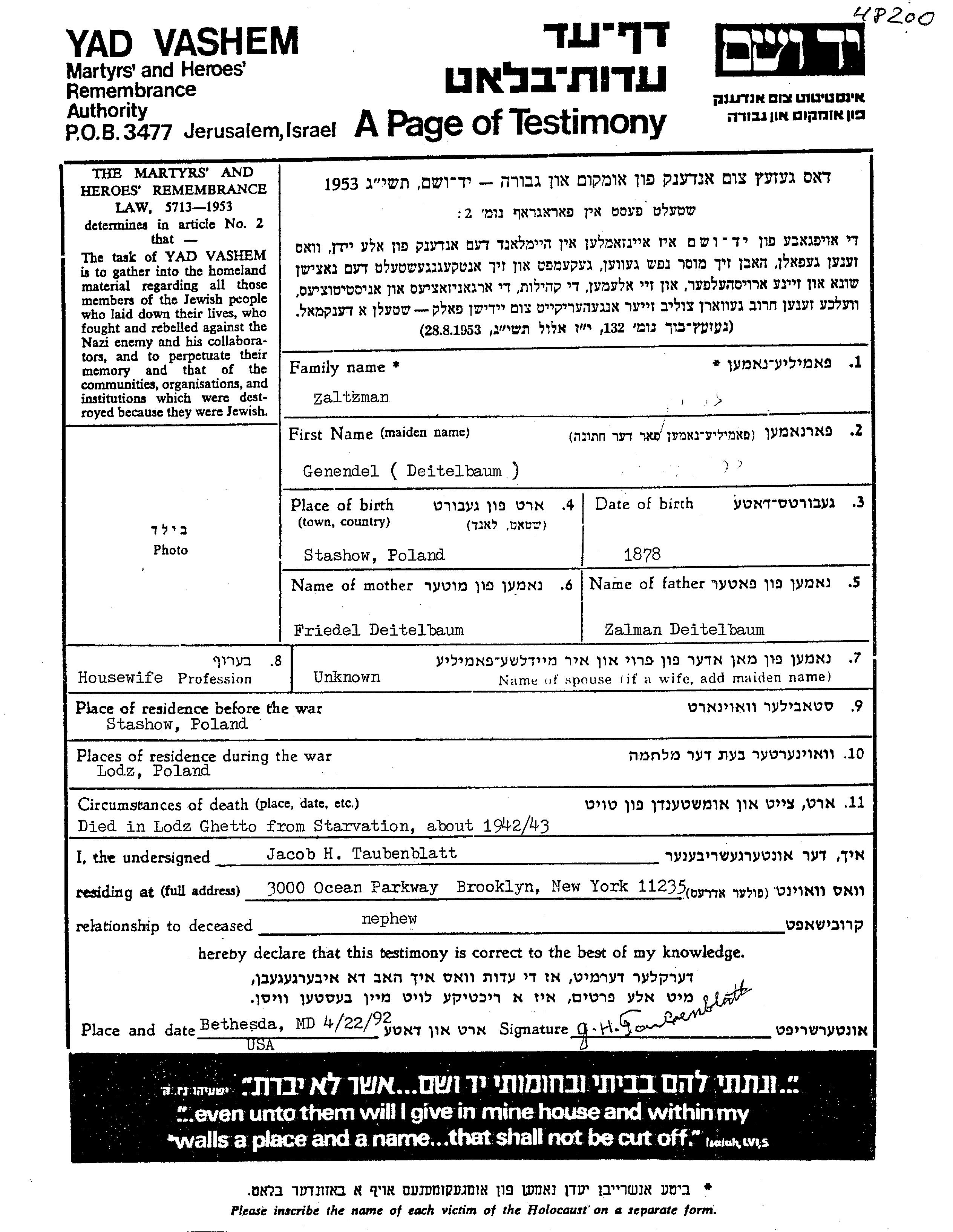 Genendel Zalzman, geb. Deitelbaum wurde im Jahr 1878 in Staszow, Polen geboren. Sie war die Tochter von Zalman und Freidel Freidel. Sie war Hausfrau und Verheiratet. Vor dem Zweiten Weltkrieg lebte sie in Staszow, Polen. Während des Krieges war sie in Lodz, Polen.