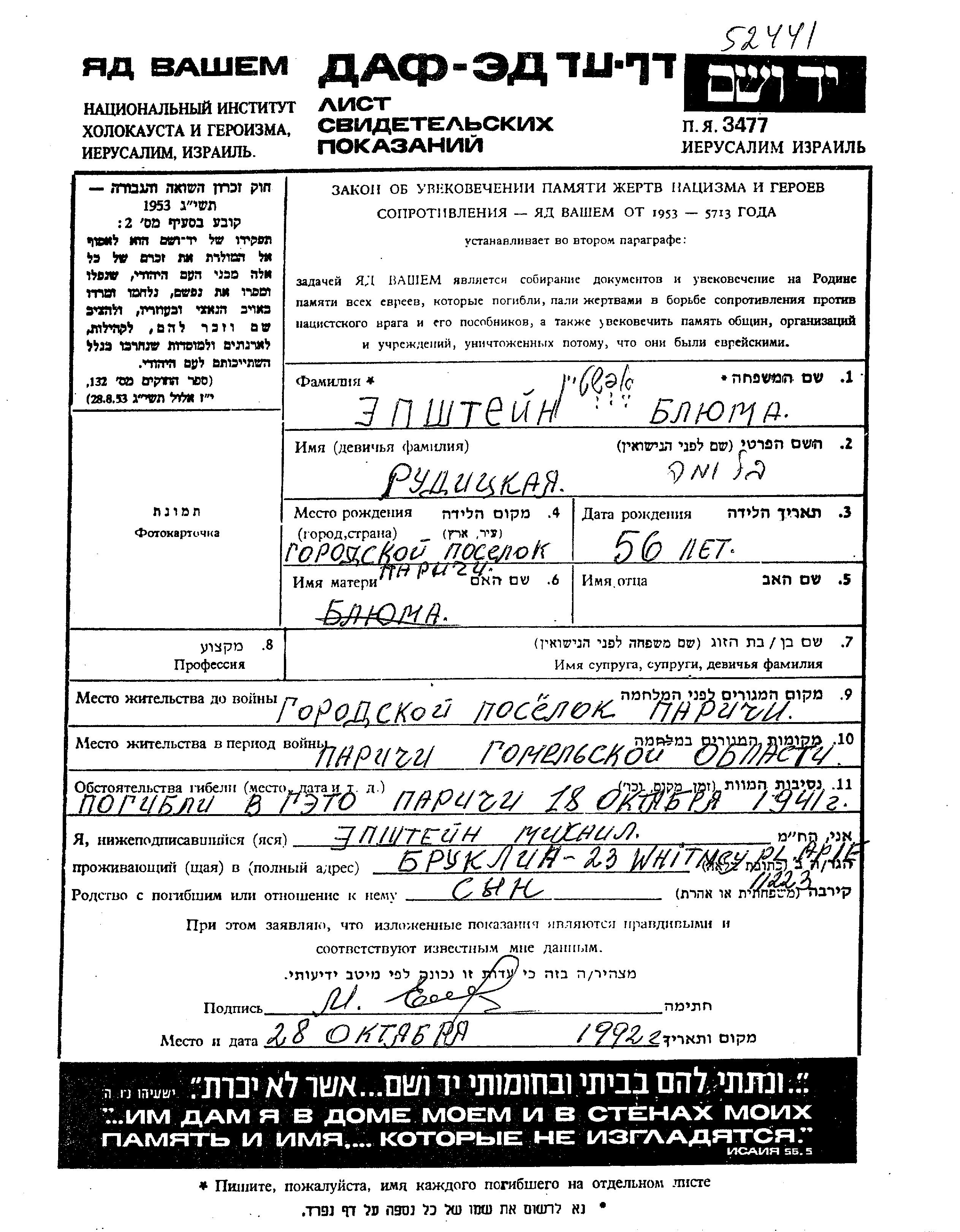 Bliuma wurde in der Schoah ermordet. Todesort: Parichi, Weißrussland (UdSSR) im Jahr 18/10/1941.