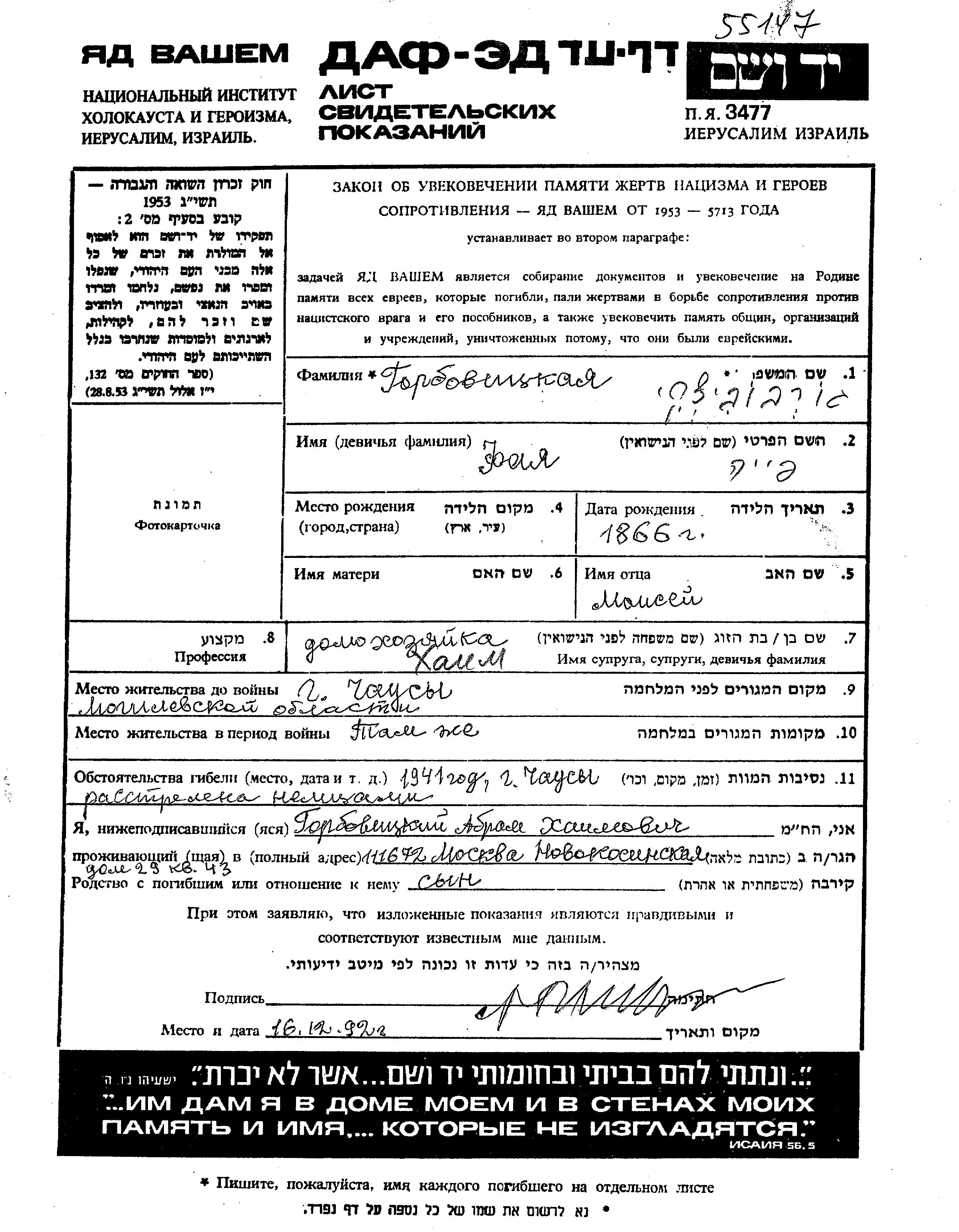 Faia Paia Gorbovitzki wurde im Jahr 1866 geboren. Sie war die Tochter von Moisei. Sie war Hausfrau und mit Khaim Verheiratet. Vor dem Zweiten Weltkrieg lebte sie in Chausy, Weißrussland (UdSSR). Während des Krieges war sie in Chausy, Weißrussland (UdSSR).