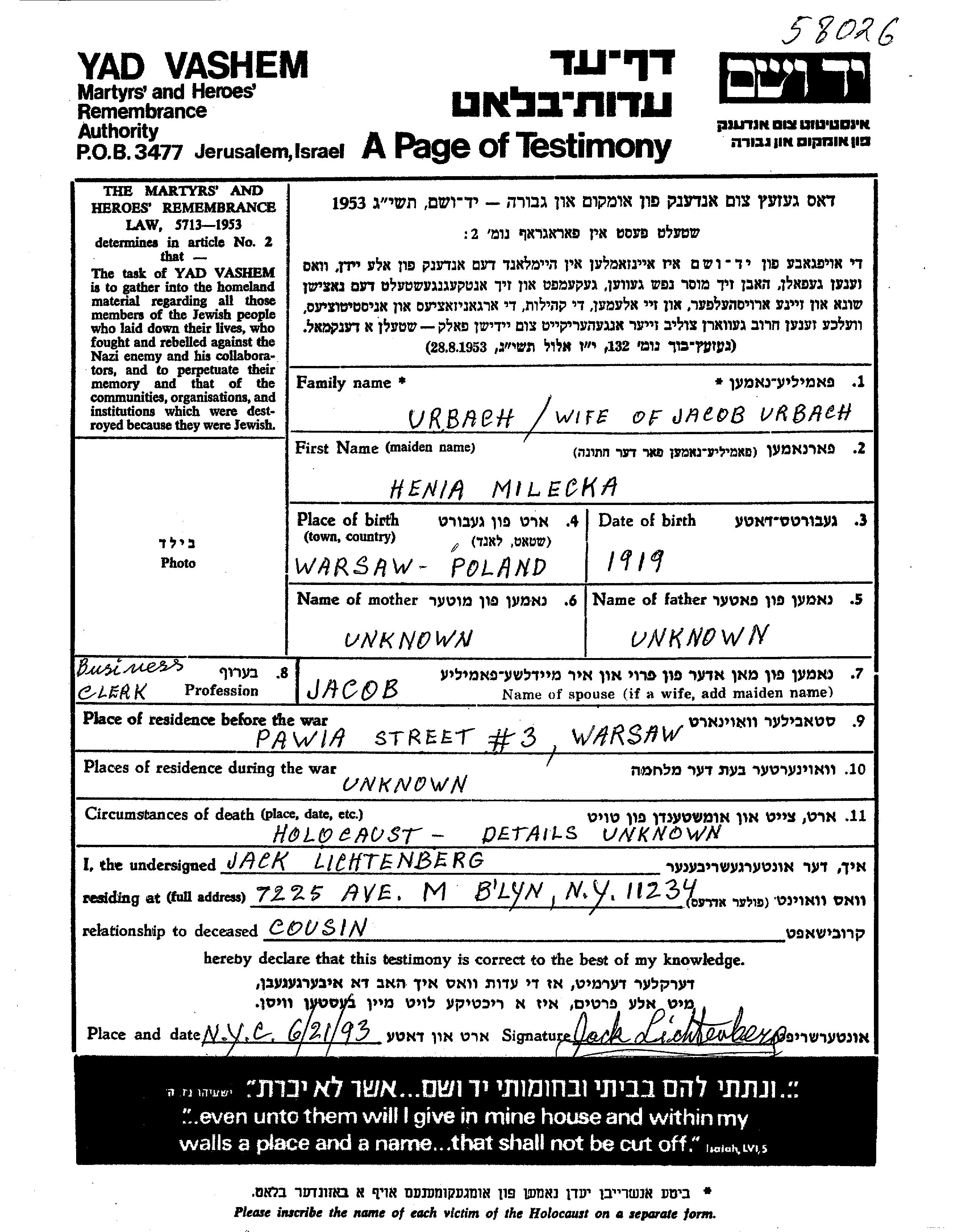 Henia Urbakh, geb. Milecki wurde im Jahr 1919 in Warszawa, Polen geboren. Sie war Angestellte/-r und mit Jacob Verheiratet. Vor dem Zweiten Weltkrieg lebte sie in Warszawa, Polen. Während des Krieges war sie in Warszawa, Polen.