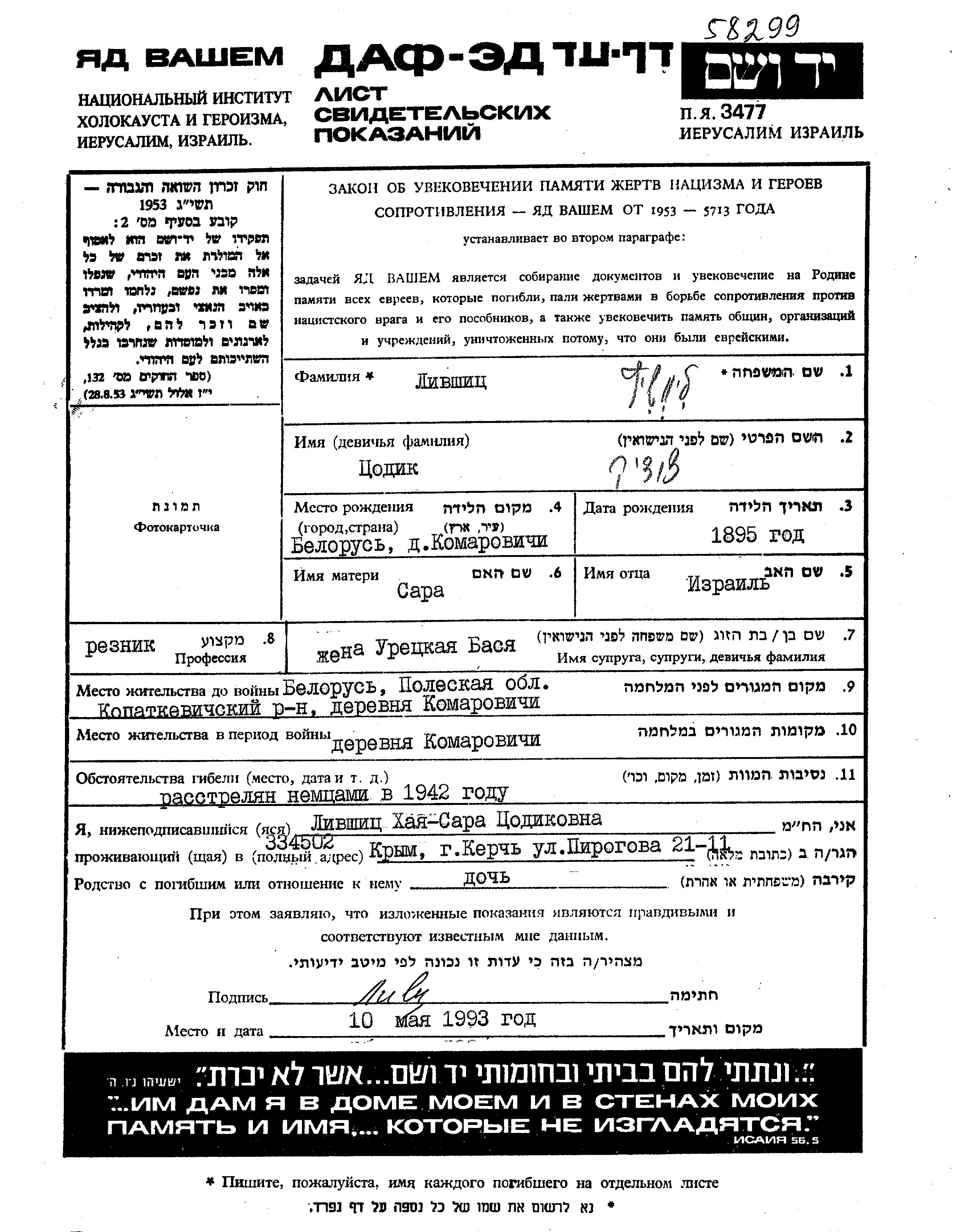 Tzodik Livshitz wurde im Jahr 1895 in Komarovichi, Weißrussland (UdSSR) geboren. Er war der Sohn von Izrail und Sara. Er war Schächter und mit Basia Verheiratet. Vor dem Zweiten Weltkrieg lebte er in Komarovichi, Weißrussland (UdSSR). Während des Krieges war er in Komarovichi, Weißrussland (UdSSR).