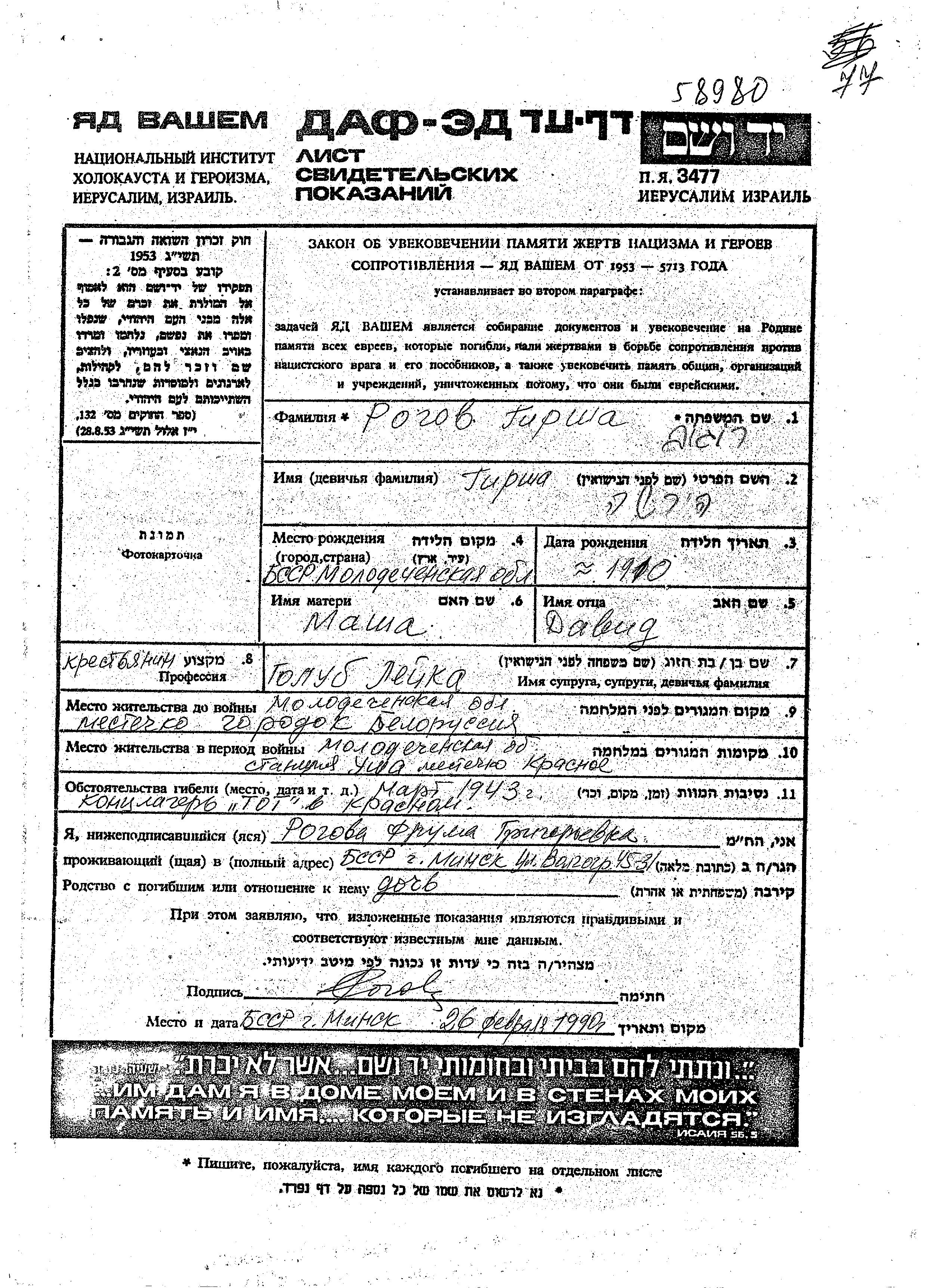 Hirsh Rogov wurde im Jahr 1910 in Wilno, Polen geboren. Er war der Sohn von David und Masha. Er war Landwirt und mit Leika Verheiratet. Vor dem Zweiten Weltkrieg lebte er in Gródek, Polen. Während des Krieges war er in Krasne, Polen.