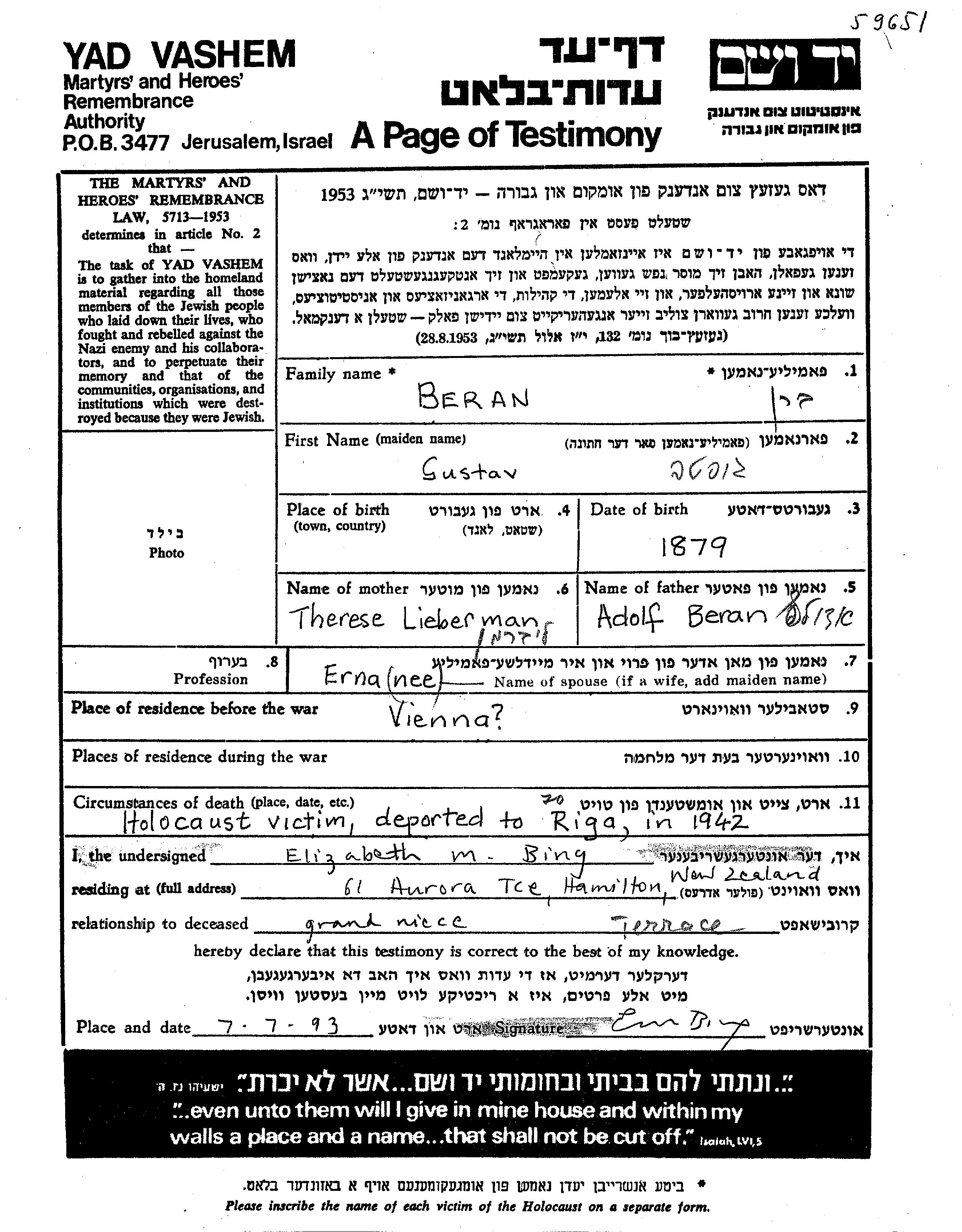 Gustav Beran Baran wurde im Jahr 1879 geboren. Er war der Sohn von Adolf und Therese, geb. Lieberman. Er war mit Erna Verheiratet. Vor dem Zweiten Weltkrieg lebte er in Wien, Österreich.