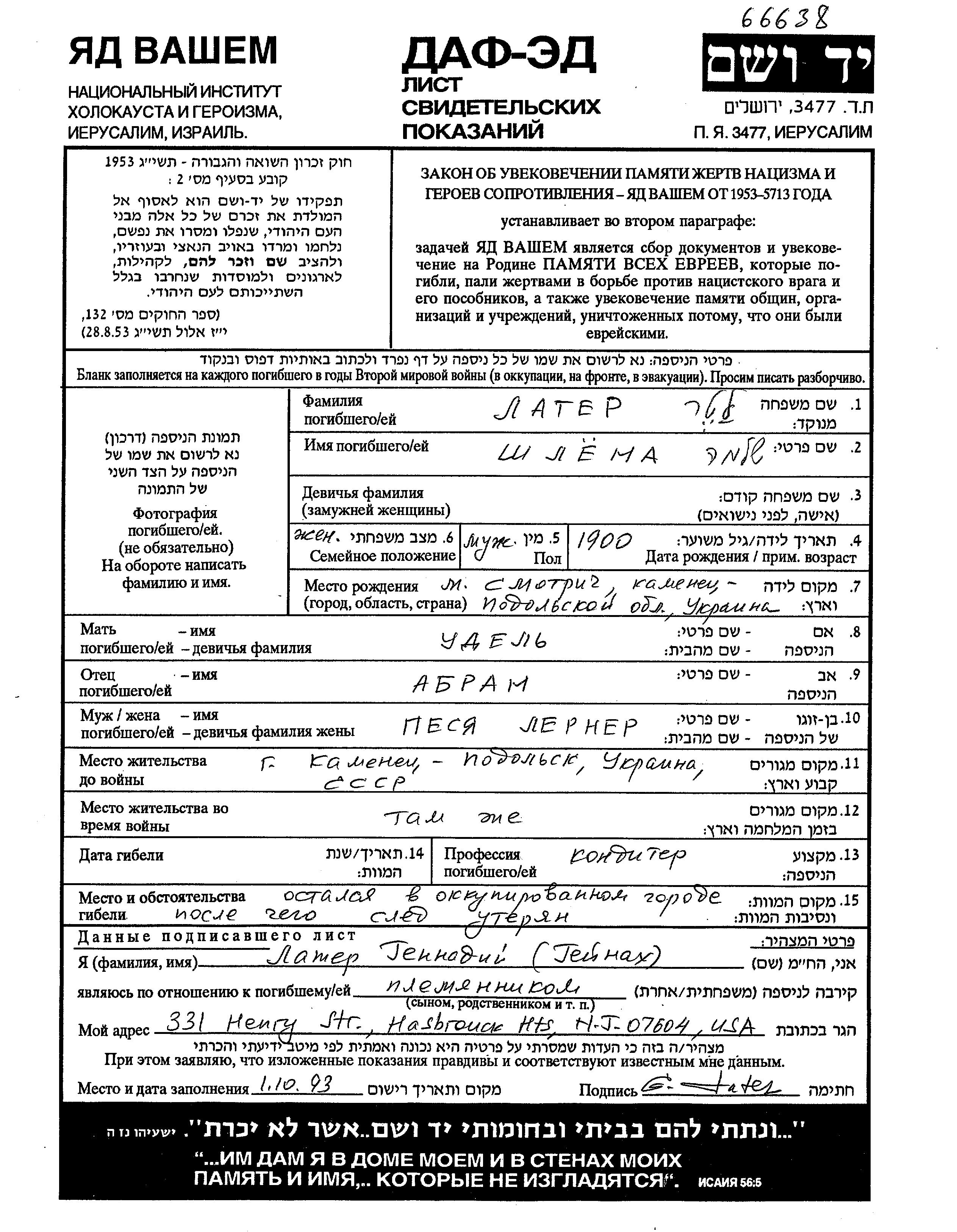 Shlioma Later wurde im Jahr 1900 in Smotrich, Ukraine (UdSSR) geboren. Er war der Sohn von Abram und Udel. Er war Bäcker/-in und mit Pesia Verheiratet. Vor dem Zweiten Weltkrieg lebte er in Kamenets Podolskiy, Ukraine (UdSSR). Während des Krieges war er in Kamenets Podolskiy, Ukraine (UdSSR).