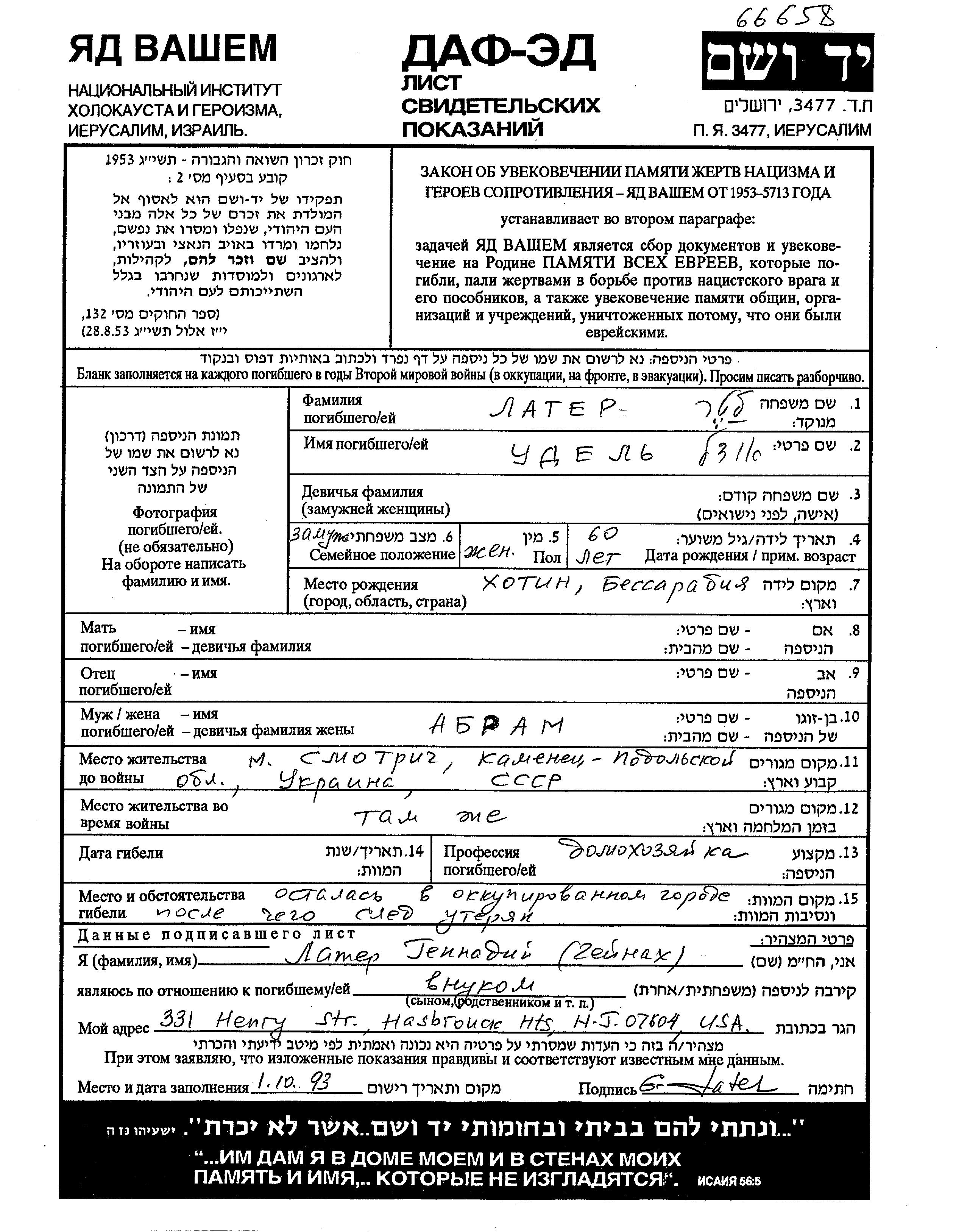 Udel Later wurde in Hotin, Rumänien geboren. Sie war Hausfrau und mit Abram Verheiratet. Vor dem Zweiten Weltkrieg lebte sie in Smotrich, Ukraine (UdSSR). Während des Krieges war sie in Smotrich, Ukraine (UdSSR).