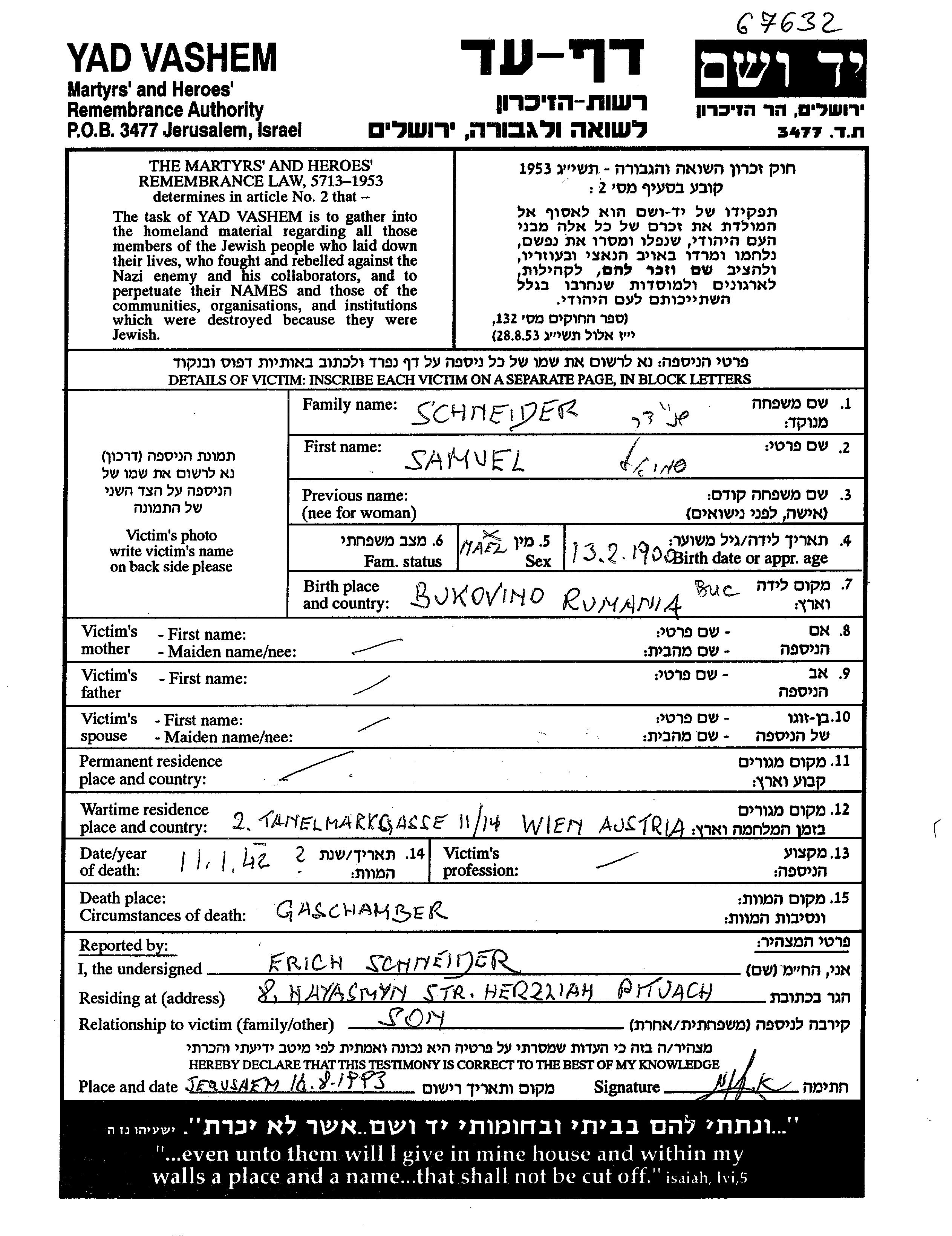 Samuel Schneider wurde im Jahr 1900 in Bukovina, Rumänien geboren. Er war mit Rebeka Verheiratet. Während des Krieges war er in Wien, Österreich.