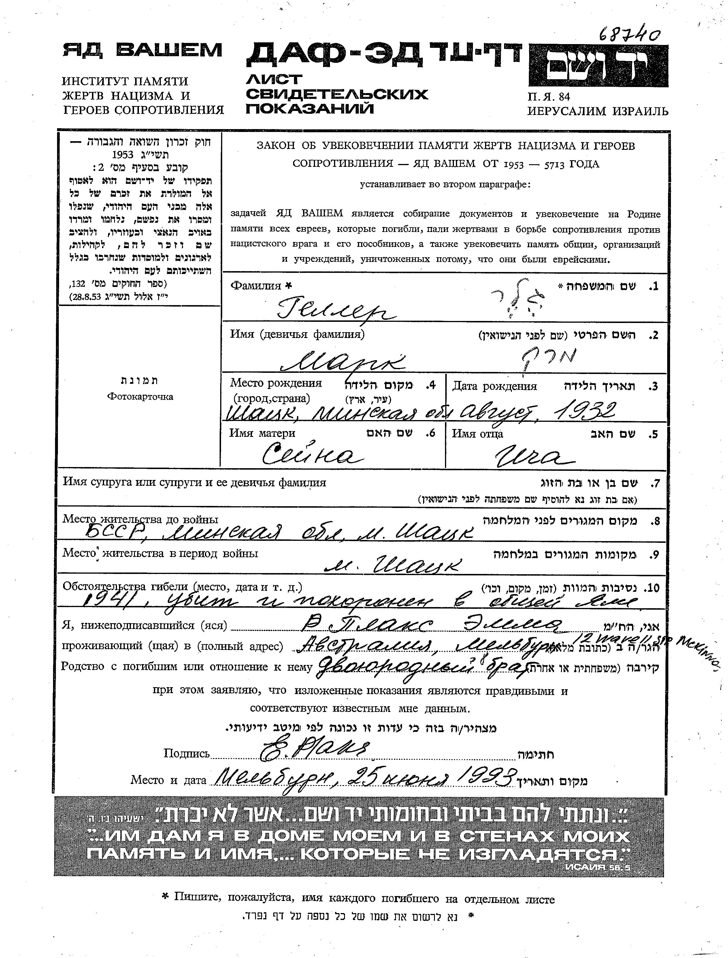 Mark Geler wurde im Jahr 1932 in Shatsk, Weißrussland (UdSSR) geboren. Er war der Sohn von Icha und Seina. Er war Kind. Vor dem Zweiten Weltkrieg lebte er in Shatsk, Weißrussland (UdSSR). Während des Krieges war er in Shatsk, Weißrussland (UdSSR).