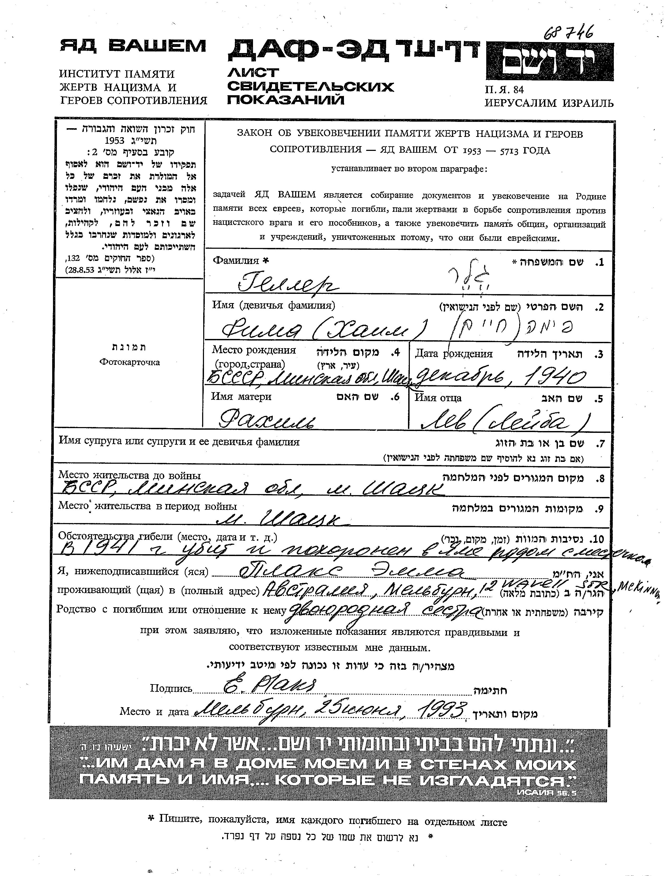 Khaim Fima Geler wurde im Jahr 1940 in Shatsk, Weißrussland (UdSSR) geboren. Er war der Sohn von Icha und Seina. Er war Kind. Vor dem Zweiten Weltkrieg lebte er in Shatsk, Weißrussland (UdSSR). Während des Krieges war er in Shatsk, Weißrussland (UdSSR).