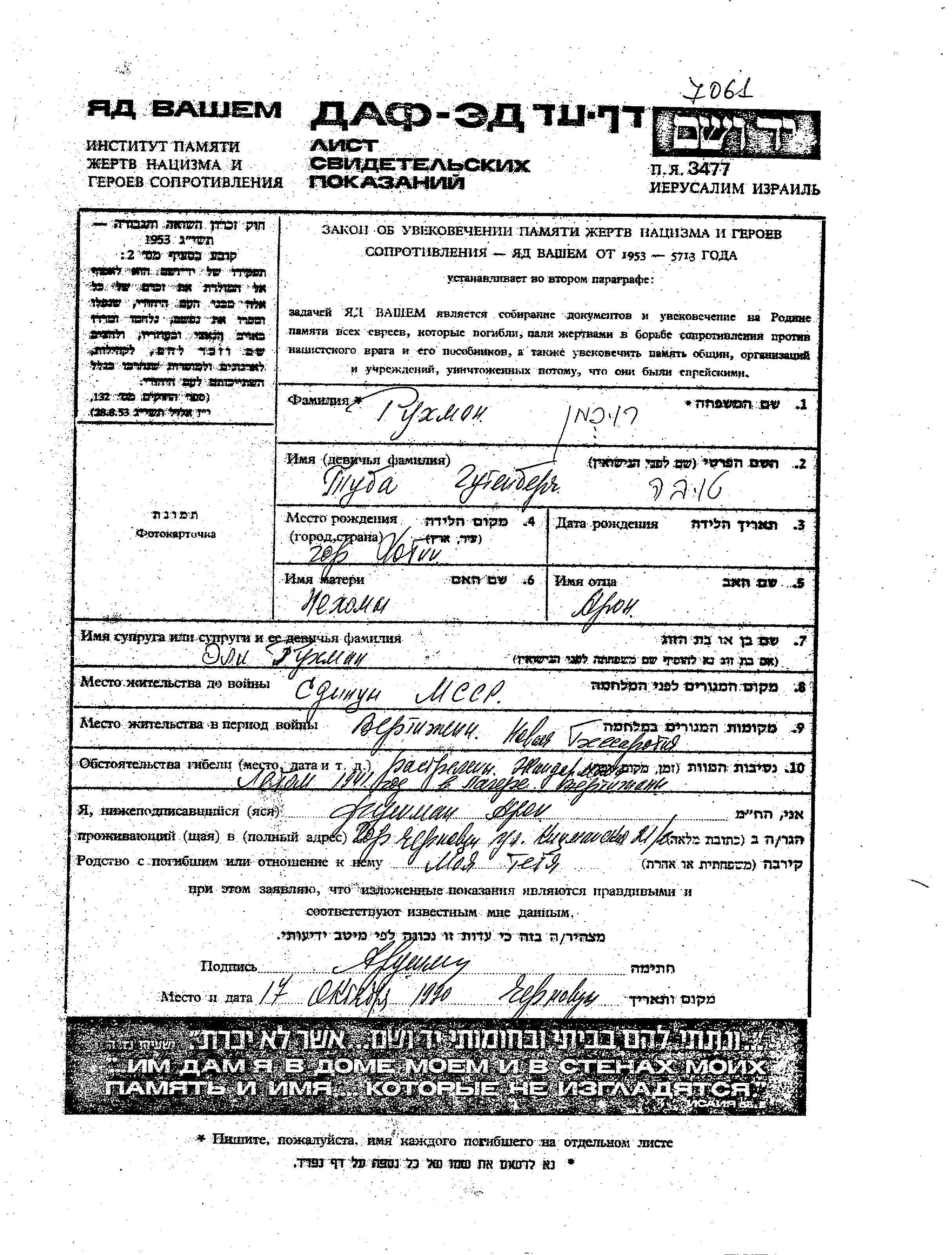 Tuba Tova Rukhman, geb. Gutenberg wurde in Hotin, Rumänien geboren. Sie war die Tochter von Aron und Nekhamy Nekhama. Sie war mit Eli Verheiratet. Vor dem Zweiten Weltkrieg lebte sie in Edineti, Rumänien. Während des Krieges war sie in Vertujeni, Rumänien.