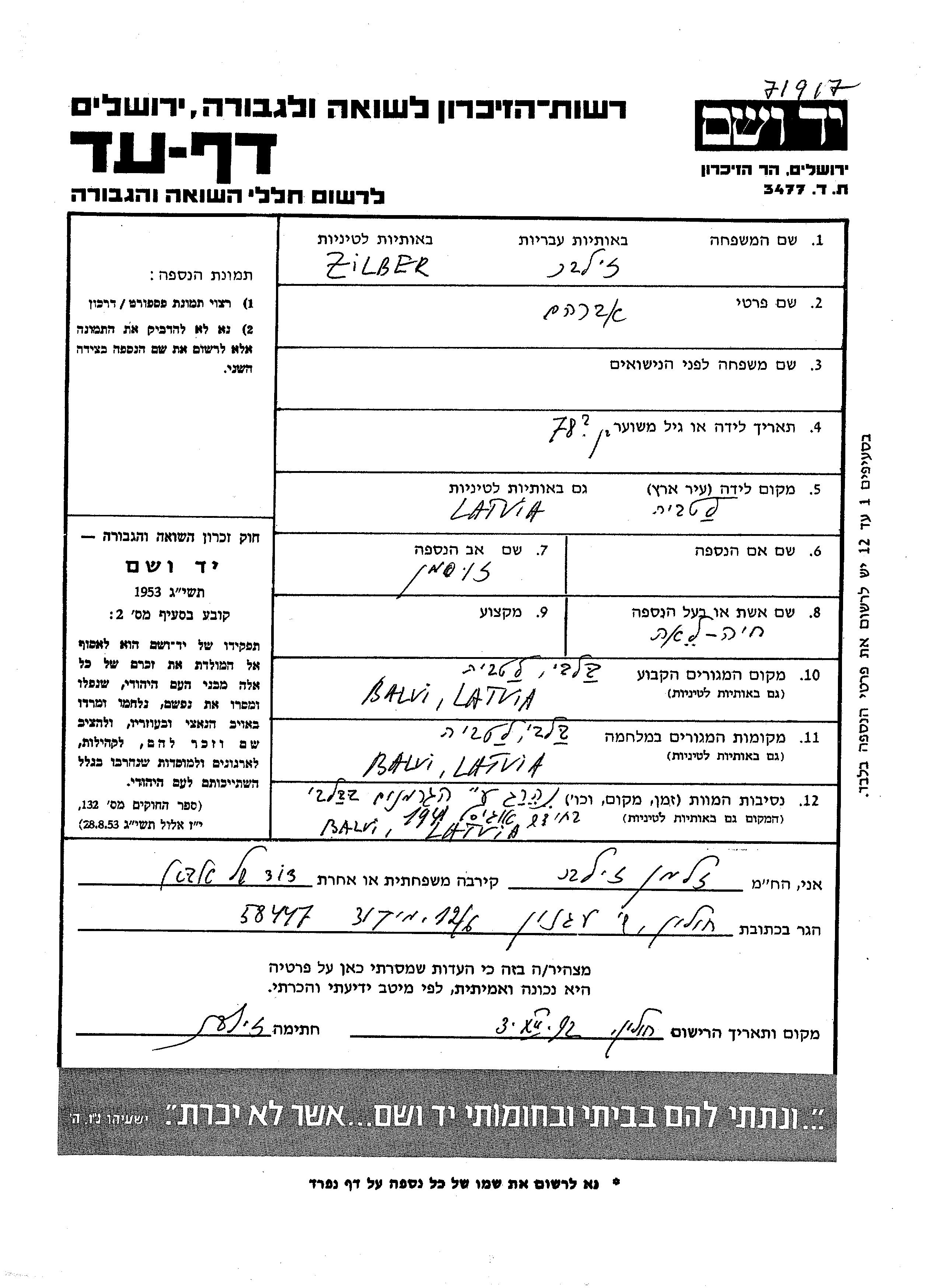 Abraham Zilber wurde im Jahr 1863 in Lettland geboren. Er war der Sohn von Zusman. Er war mit Chaia Lea Verheiratet. Vor dem Zweiten Weltkrieg lebte er in Balvi, Lettland. Während des Krieges war er in Balvi, Lettland.