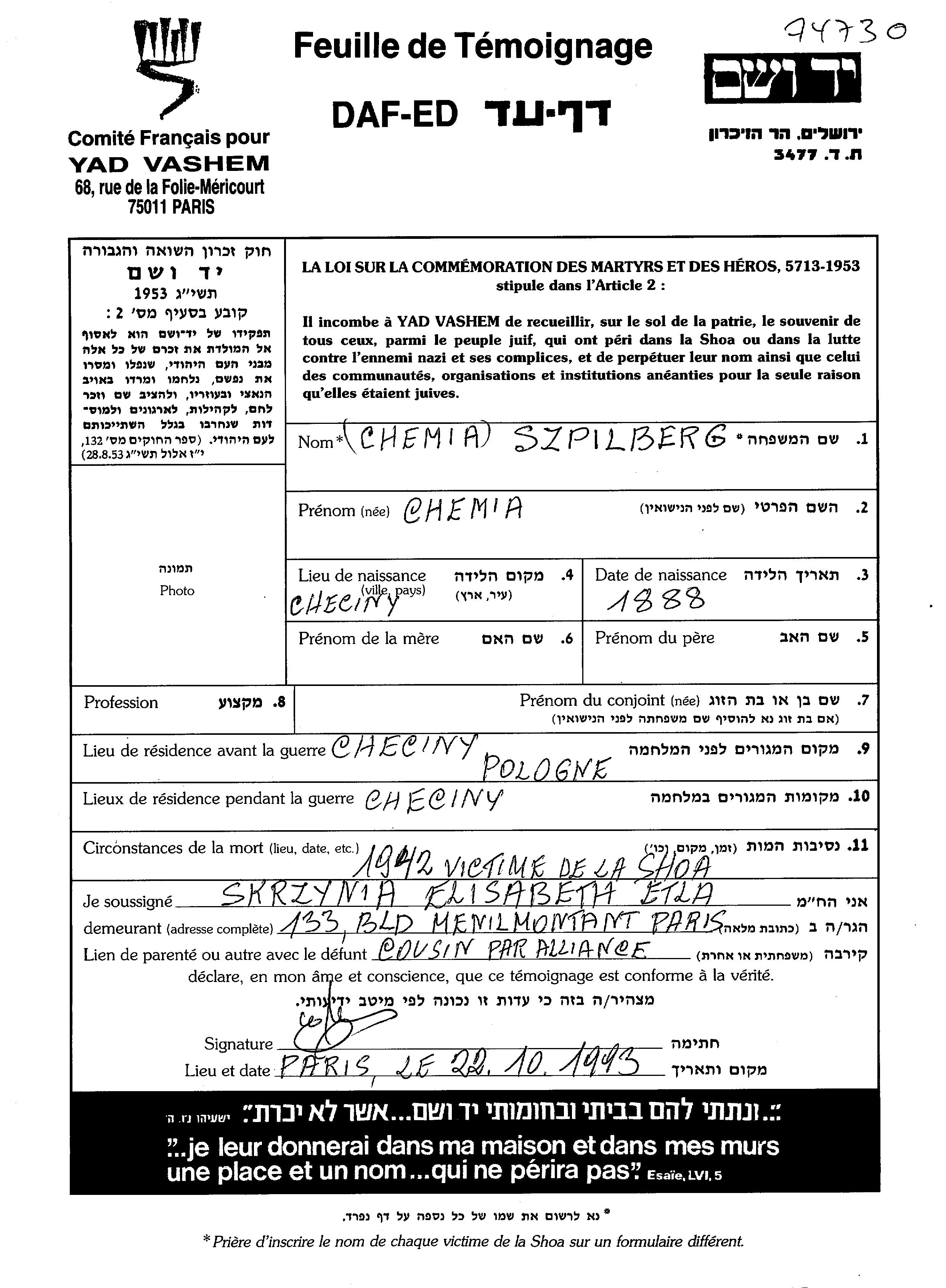 Chemia Szpilberg wurde im Jahr 1888 in Chęciny, Polen geboren. Er war mit Brandla Verheiratet. Vor dem Zweiten Weltkrieg lebte er in Chęciny, Polen. Während des Krieges war er in Chęciny, Polen.