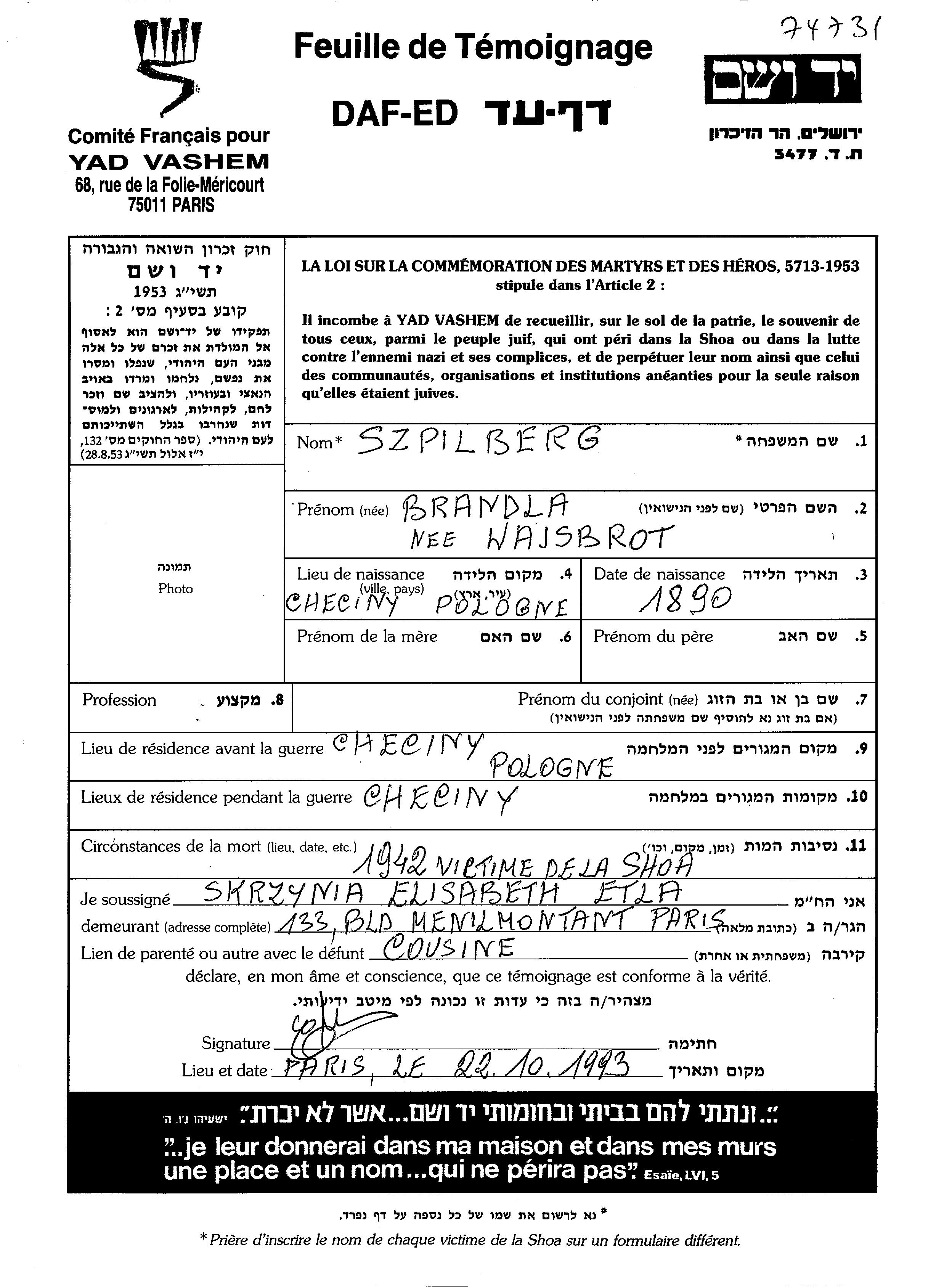 Brandla Szpilberg, geb. Wajsbrot wurde im Jahr 1890 in Chęciny, Polen geboren. Sie war Verheiratet. Vor dem Zweiten Weltkrieg lebte sie in Chęciny, Polen. Während des Krieges war sie in Chęciny, Polen.