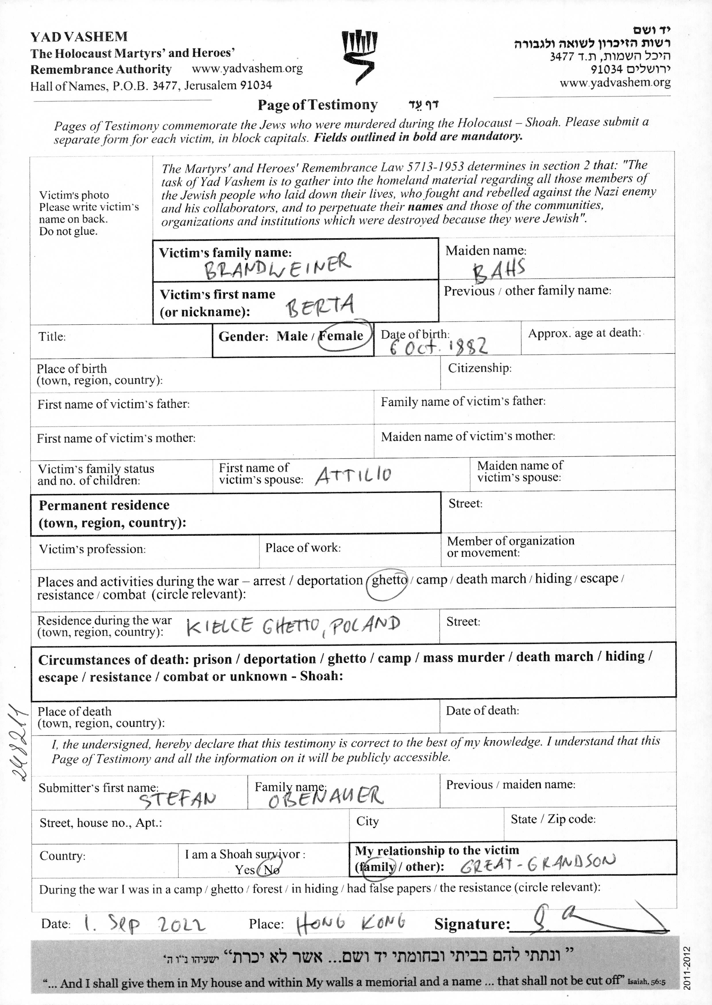 Brandweiner Berta 1882 Wien, Österreich Liste von ermordeten oesterreichischen Juden