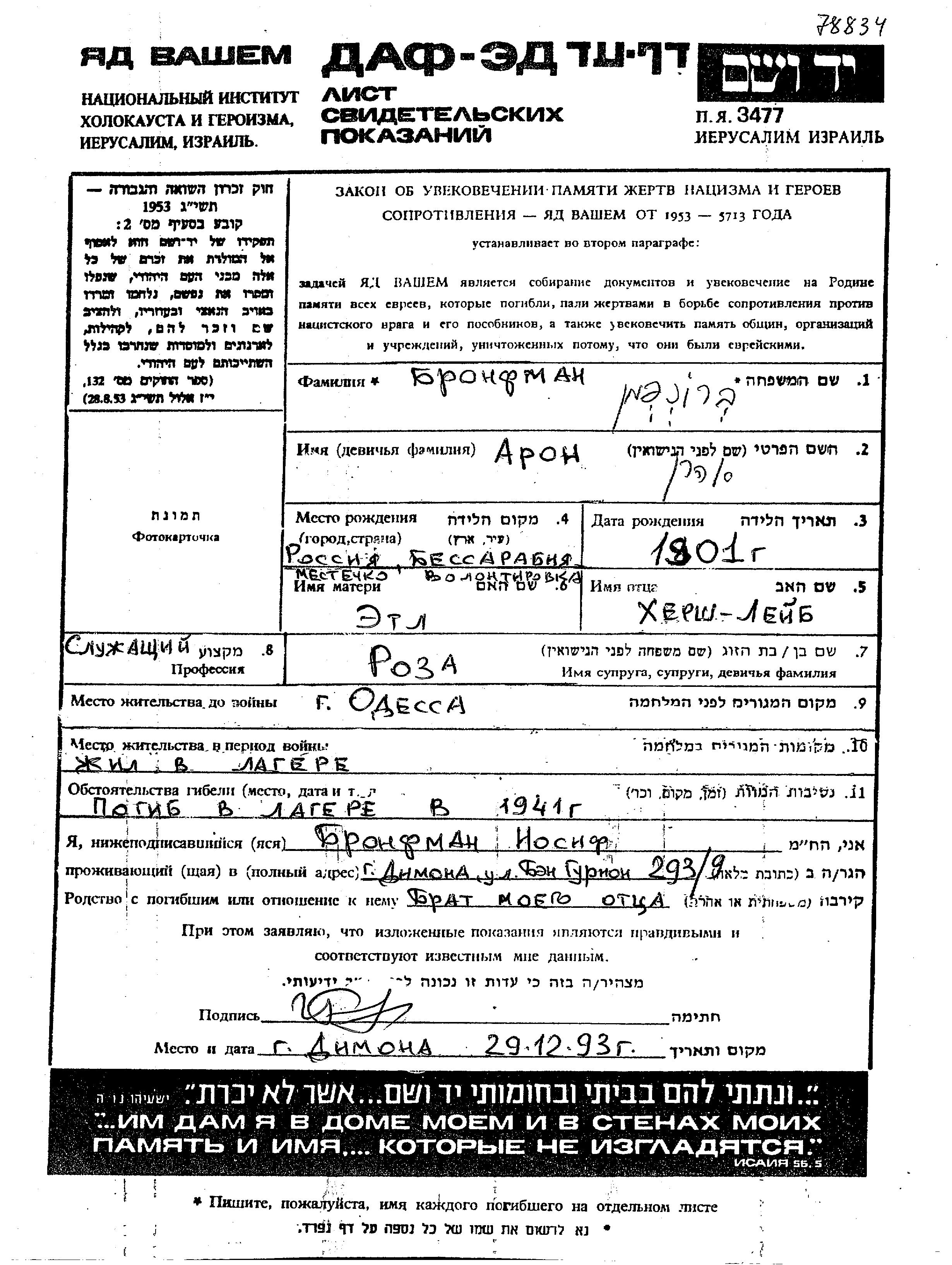 Aron Bronfman wurde im Jahr 1901 in Volintiri, Rumänien geboren. Er war der Sohn von Khersh Leib und Etl. Er war Angestellte/-r und mit Roza Verheiratet. Vor dem Zweiten Weltkrieg lebte er in Odessa, Ukraine (UdSSR).