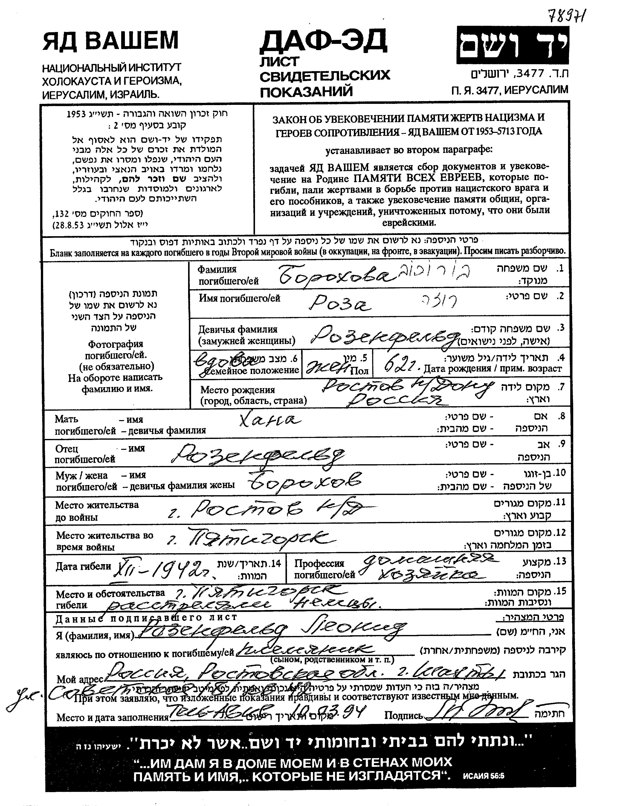 Roza Borokhov, geb. Rozenfeld wurde im Jahr 1880 in Rostov, Russland (UdSSR) geboren. Sie war die Tochter von Khana. Sie war Hausfrau und Verwitwet. Vor dem Zweiten Weltkrieg lebte sie in Rostov, Russland (UdSSR). Während des Krieges war sie in Pyatigorsk, Russland (UdSSR).